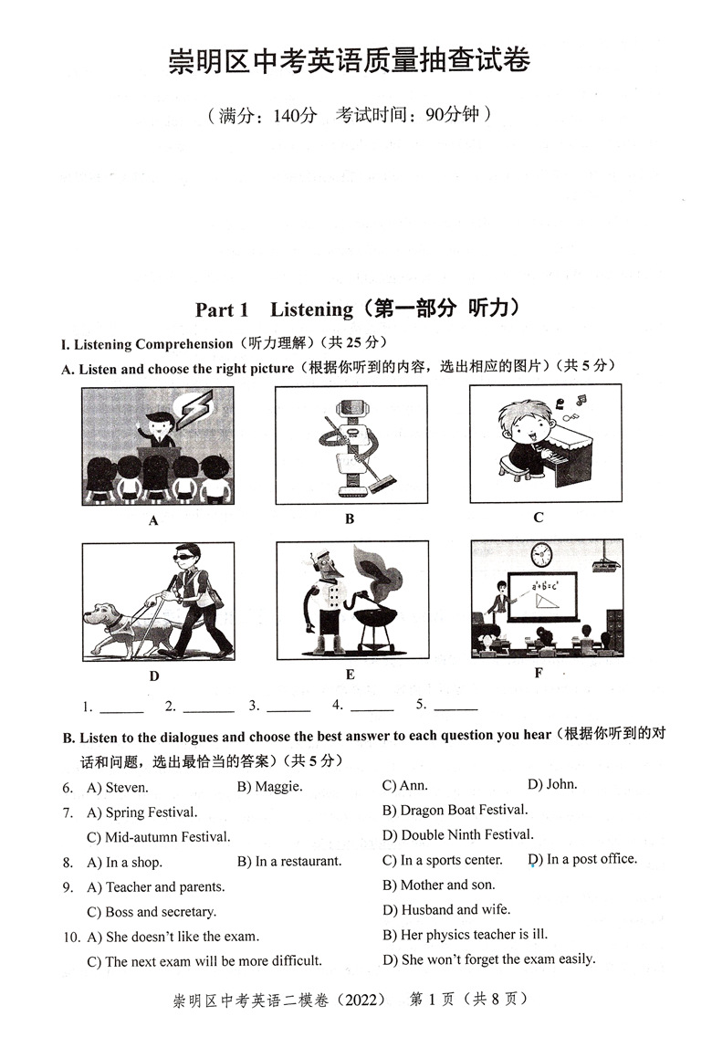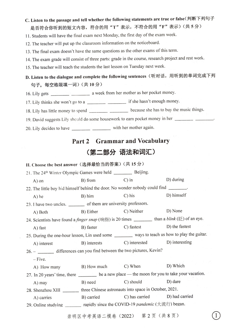 2022年版 初中九年级第一学期期末试卷 英语二模卷上海中考一模卷英语仅试卷走向成功文化课强化训练二模卷上海市各区初三