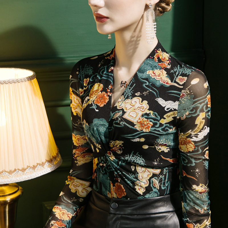 新款 碎花小衫 复古印花V领网纱打底衫 内搭春秋长袖 女修身 2025秋季