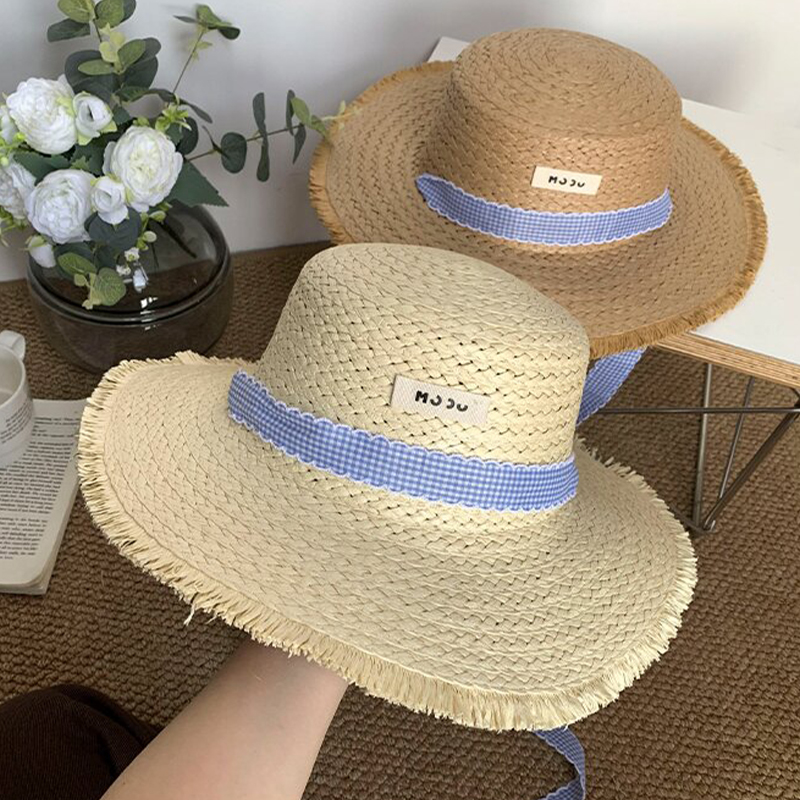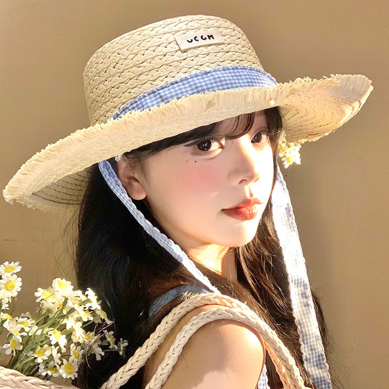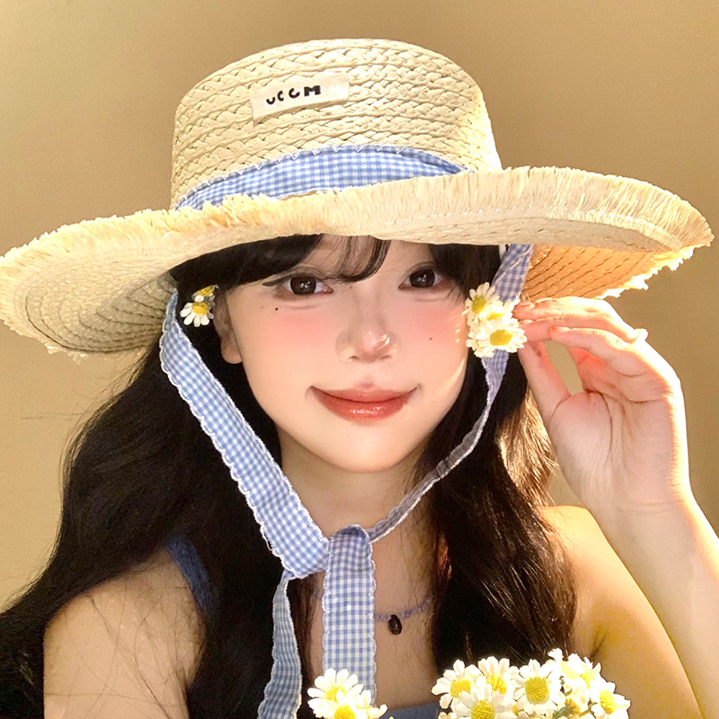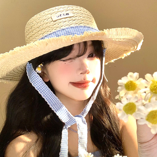 蓝色格纹绑带草帽女夏季 海边拍照度假百搭遮阳防晒沙滩帽 2025新款