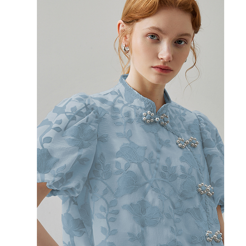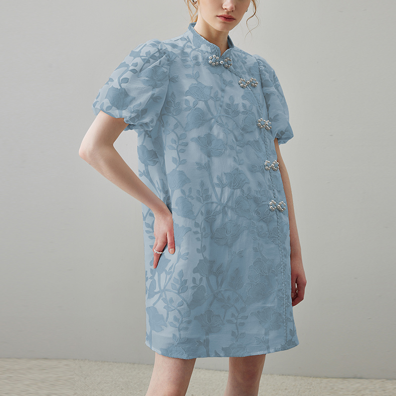 刺绣盘扣泡泡袖 夏季 旗袍裙子 国风连衣裙女2025新款 dfvc蓝色新中式