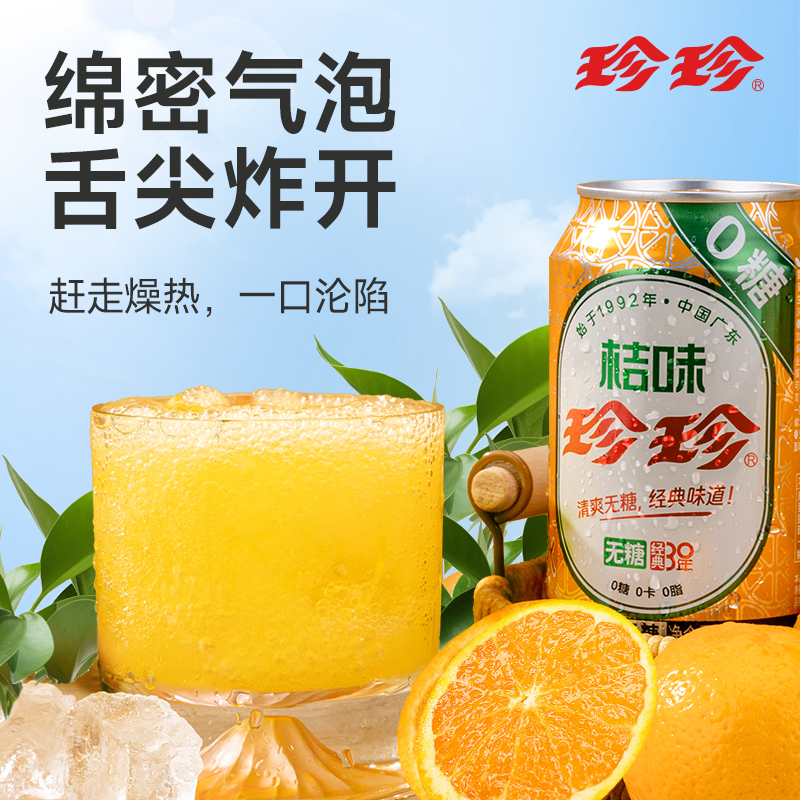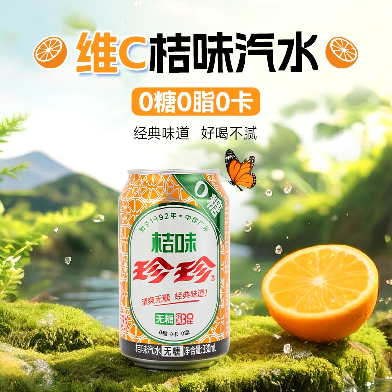 含维C 珍珍桔味碳酸饮料无糖汽水零糖0糖0脂0卡330ml罐装 秒杀