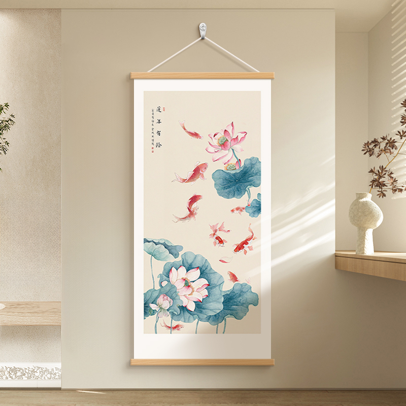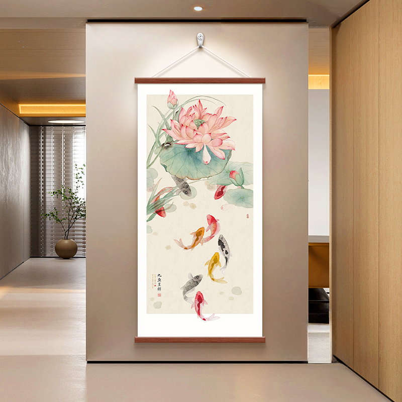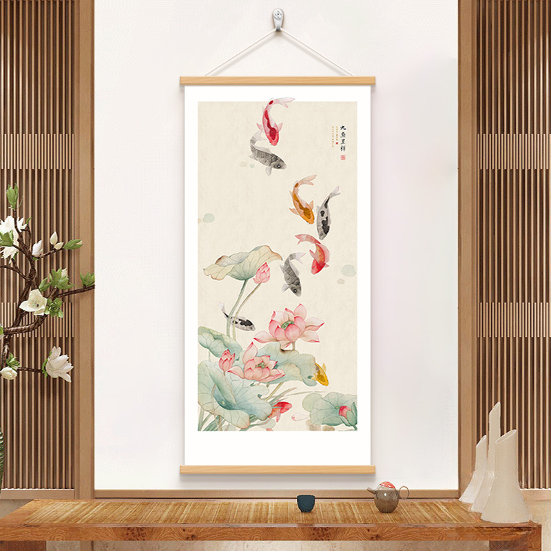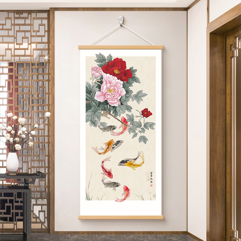 聚财九鱼图荷花装 入户玄关挂画牡丹茶室书房办公室壁画 饰画新中式