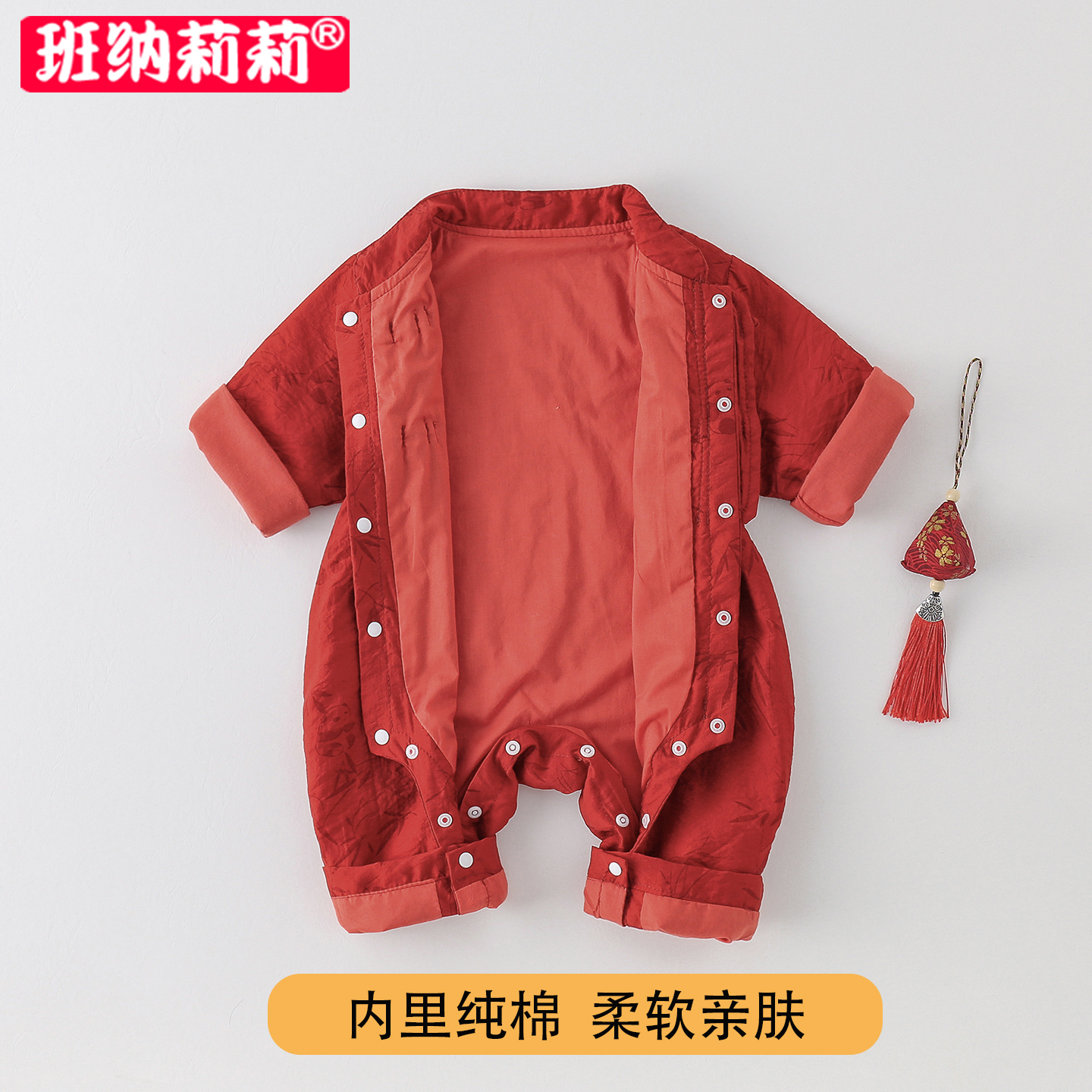 国风喜庆红色连体衣周岁宝宝秋装 套装 百天满月婴儿衣服秋季 新中式
