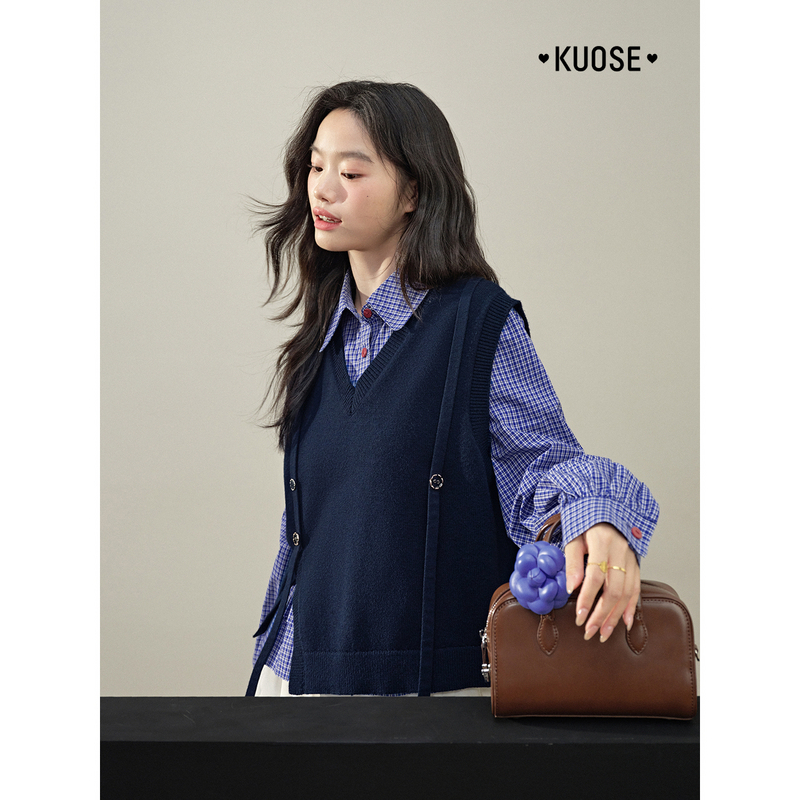 短款 阔色格子蓝衬衫 女小衫 miu系穿搭新款 上衣 荷叶边衬衣2025秋季