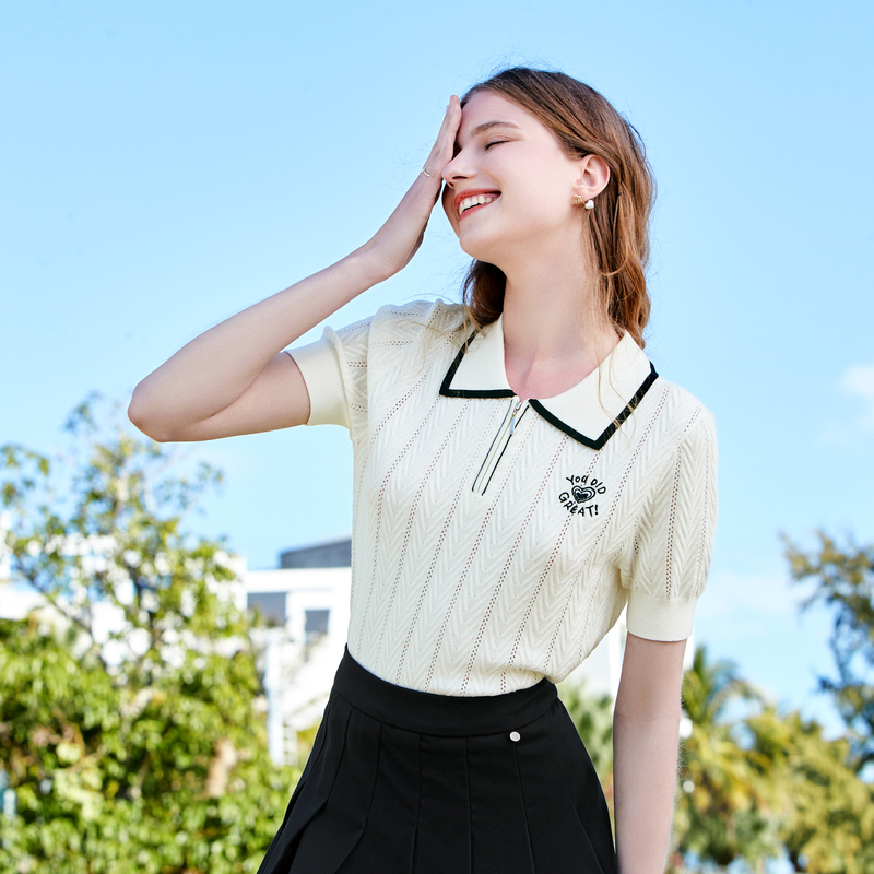套头针织衫 betu百图女装 爱心绣花拉链polo领短袖 新款 上衣 2024夏季