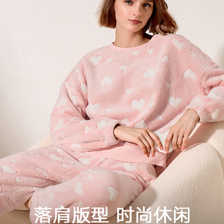 舒适暖绒落肩圆领女生睡衣睡裤 曼妮芬珊瑚绒厚款 女士家居服套装