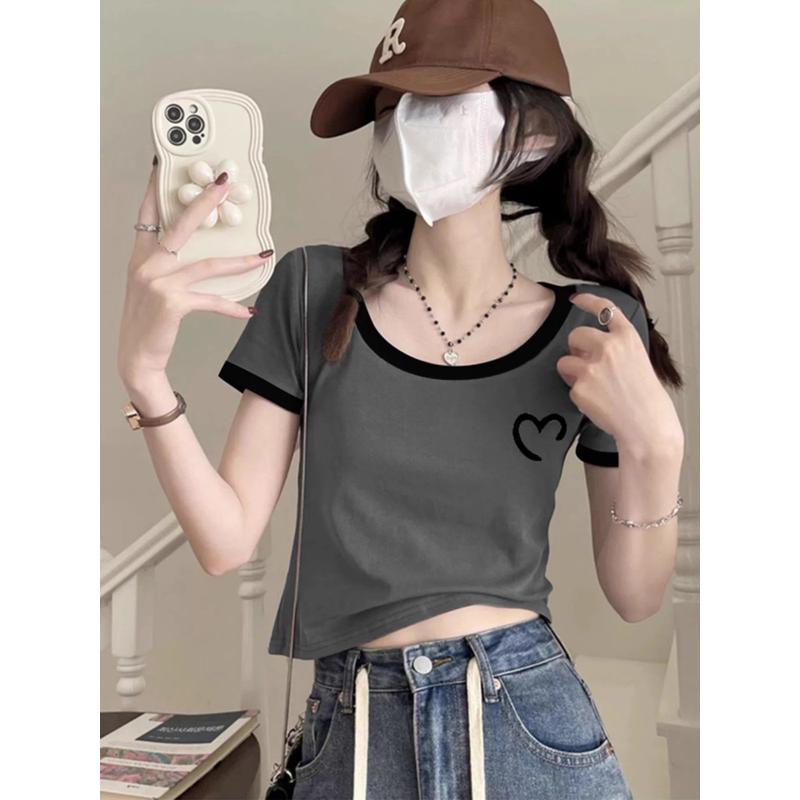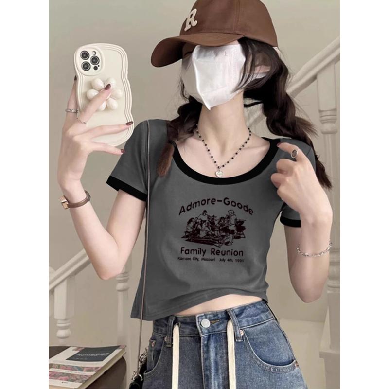 低领露锁骨印花短款 夏季 洋气卡腰上衣 T恤女2025新款 正肩U领短袖