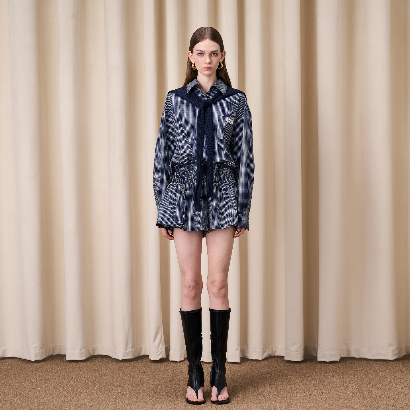 戚砚笛同款 短裤 Eimismosol25秋新款 披肩格子衬衫 休闲套装 长袖