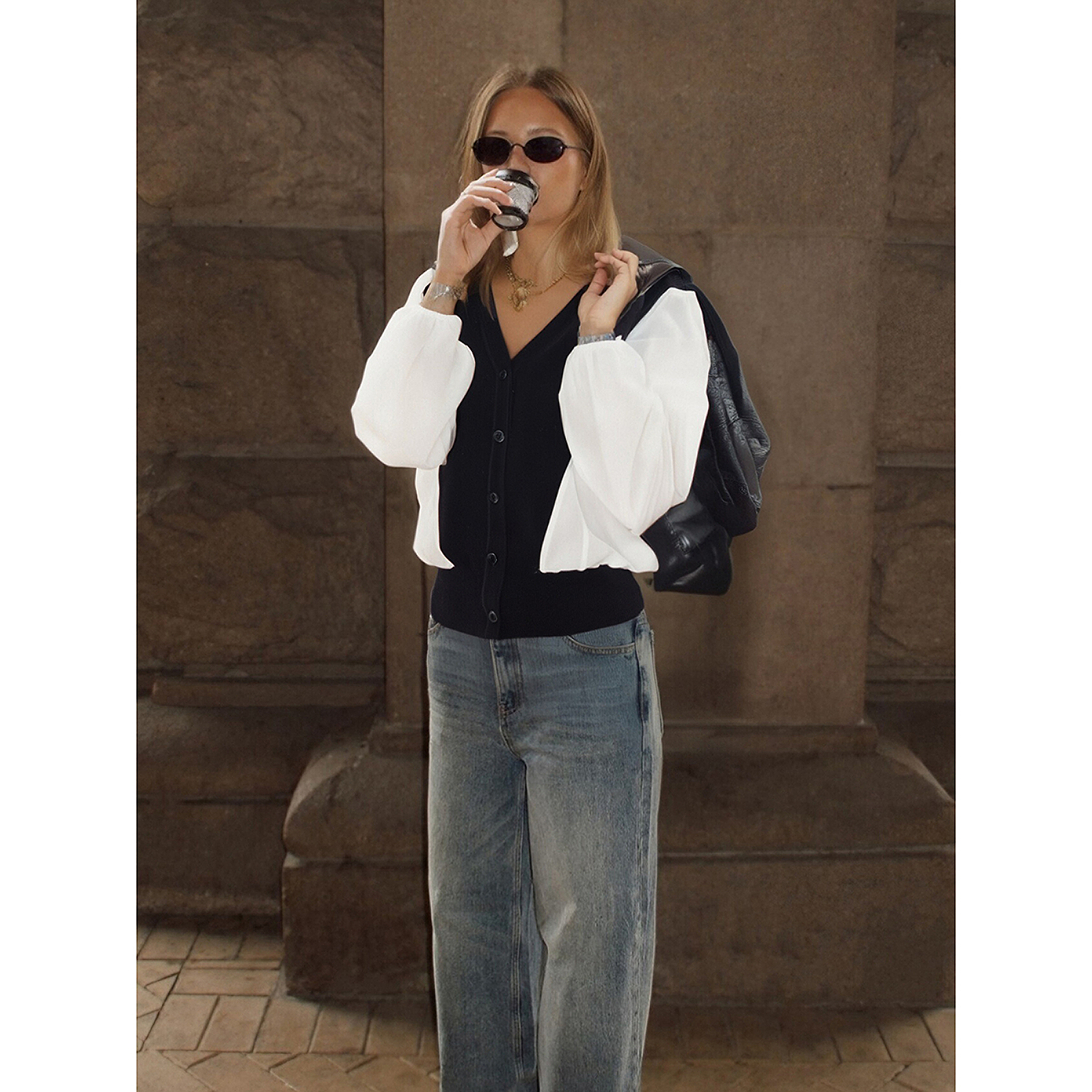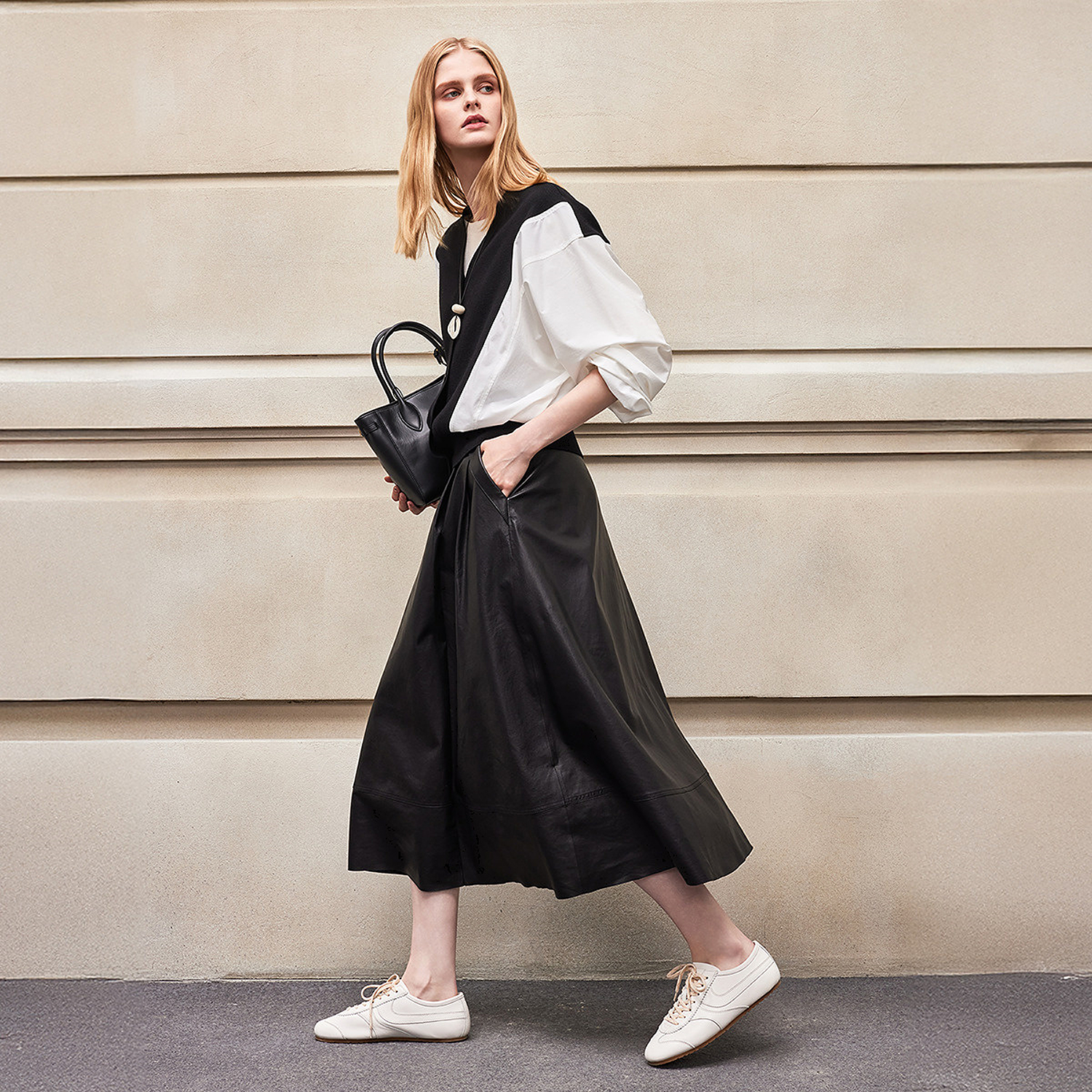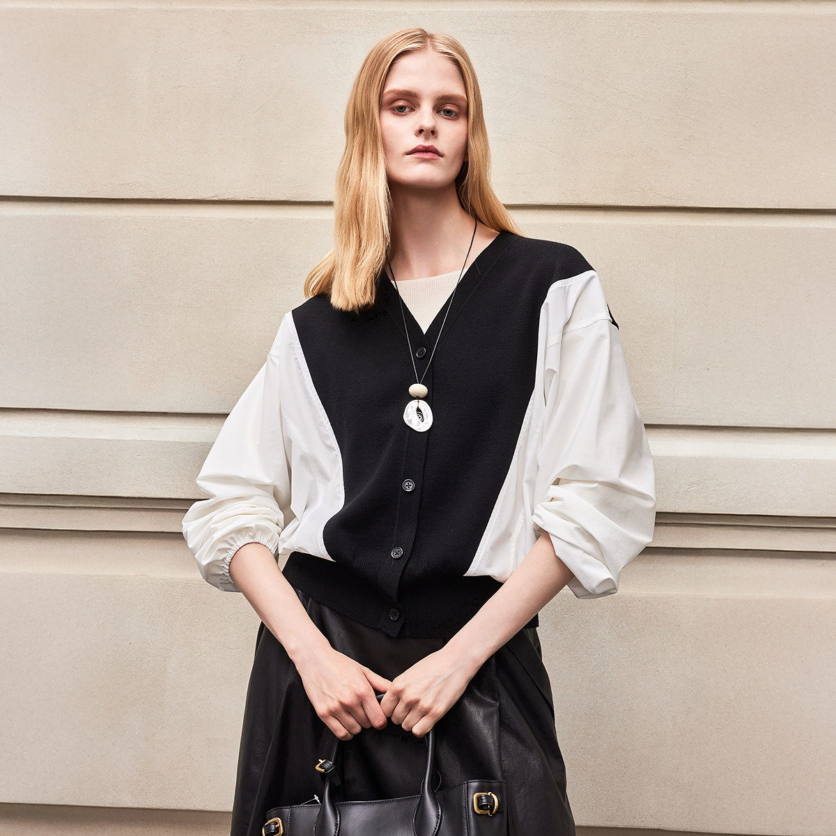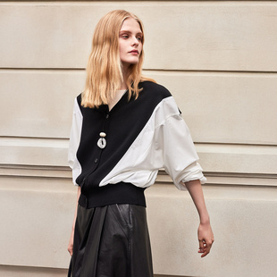 上衣 宽松黑白拼色设计感针梭拼接假两件女士针织衫 BCBG新款 时尚