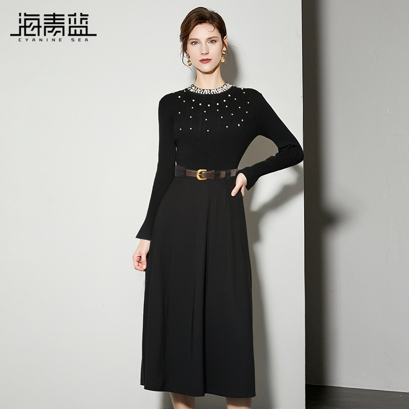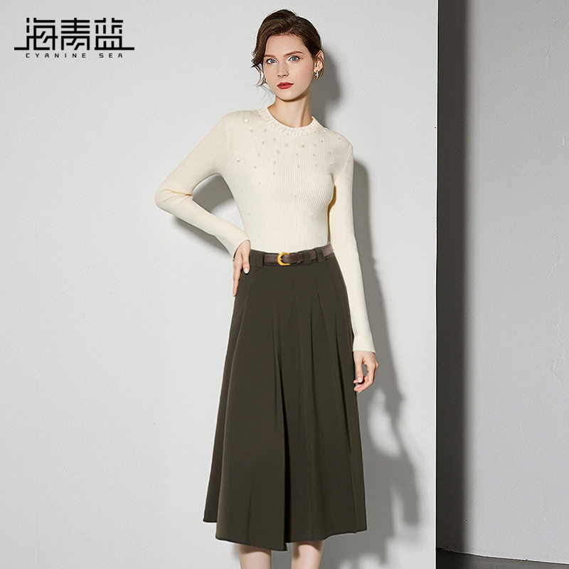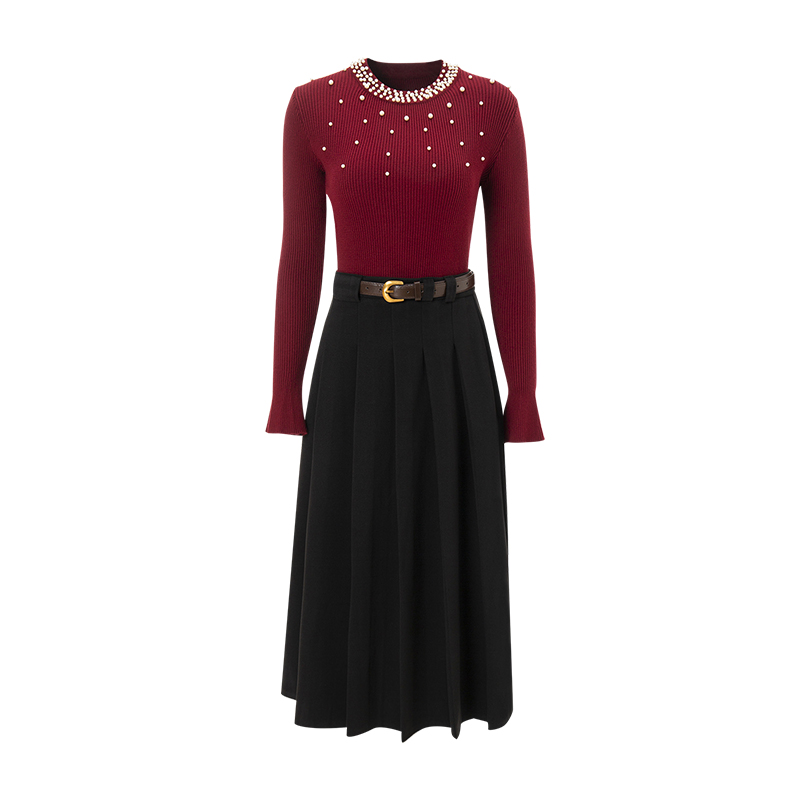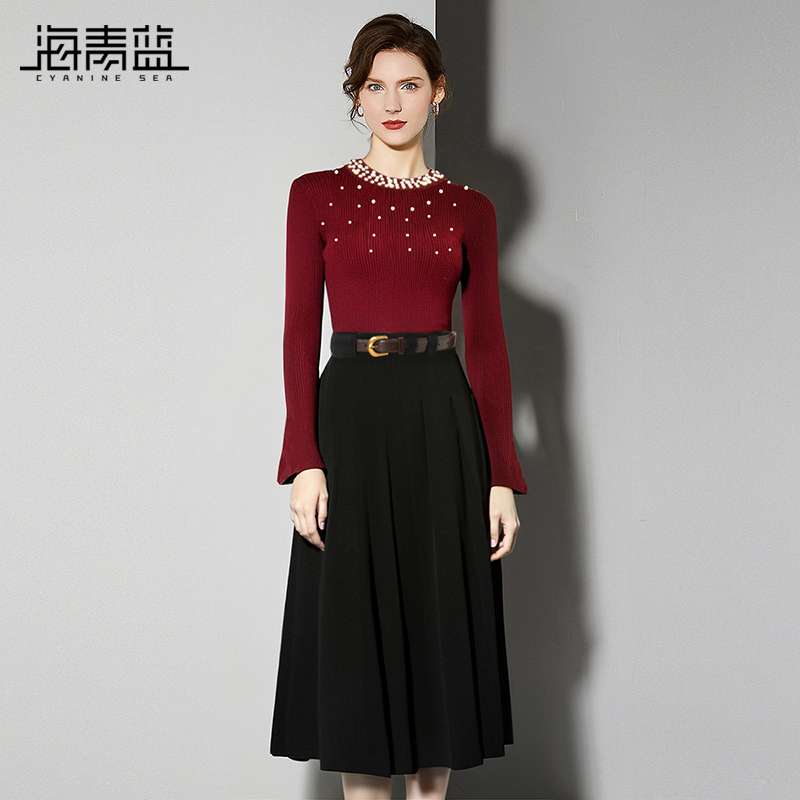 裙女2025新款 红色套装 秋冬显瘦百褶裙两件套 钉珠针织衫 海青蓝法式