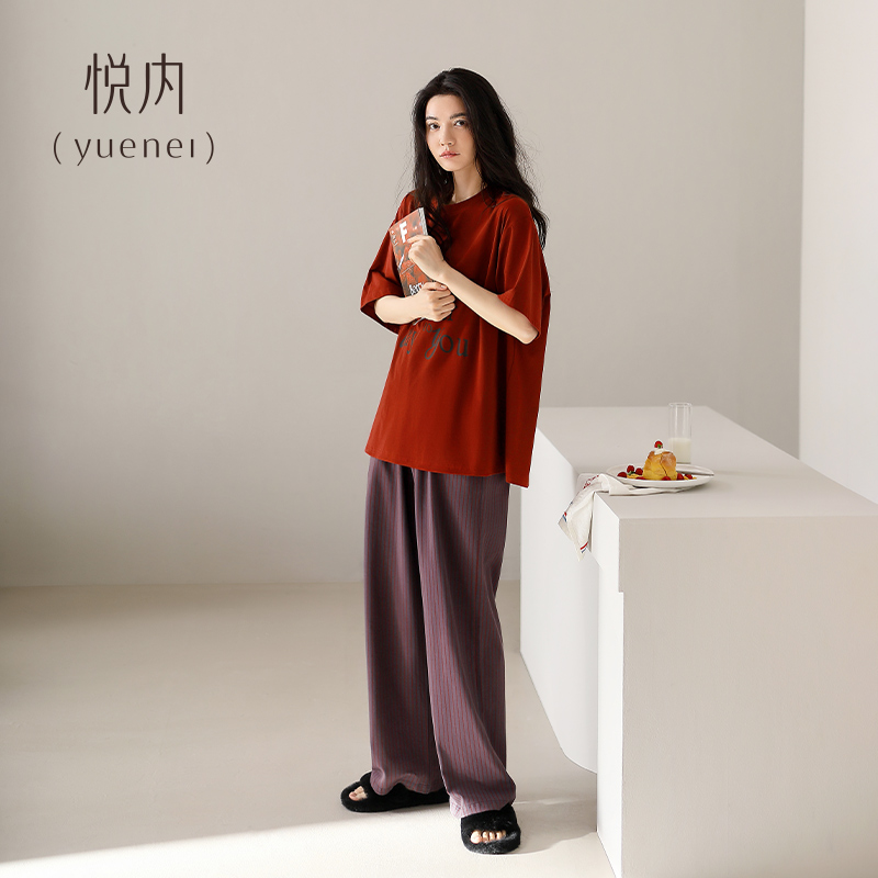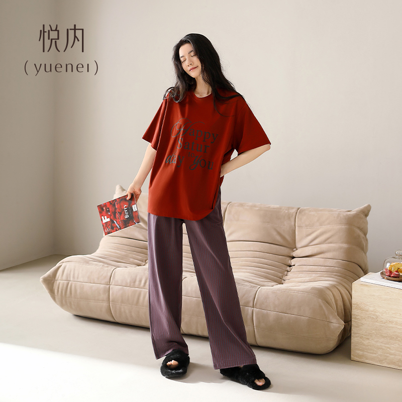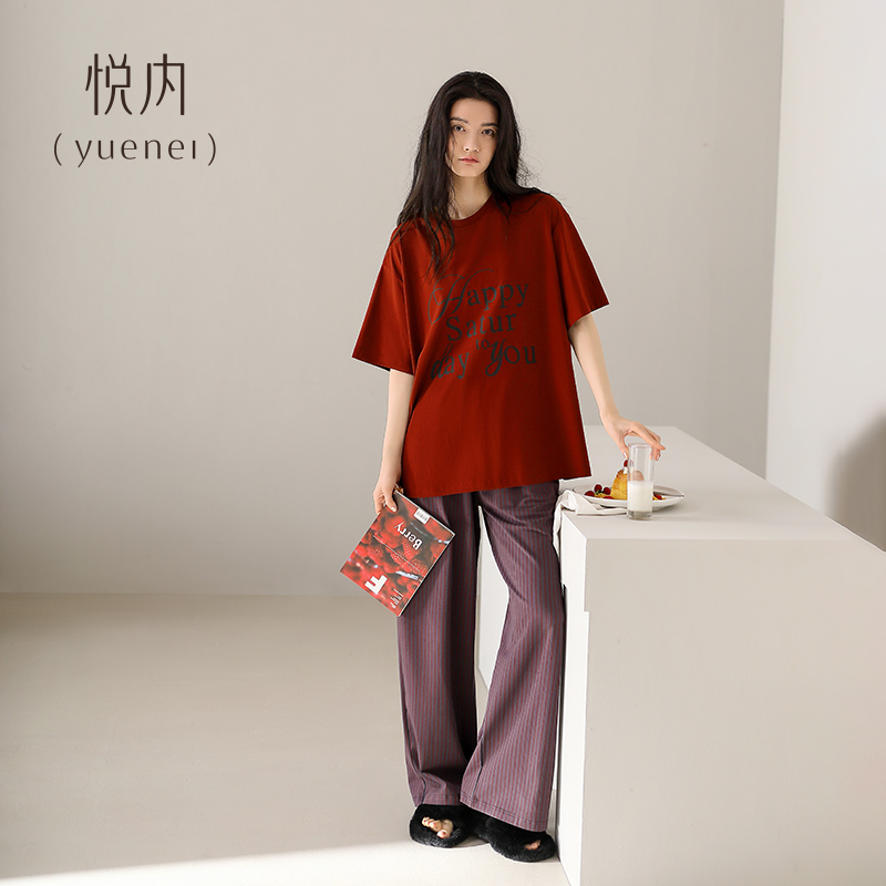 家居服休闲时尚 悦内睡衣女士夏季 长裤 纯棉短袖 字母酒红色 夏天夏款