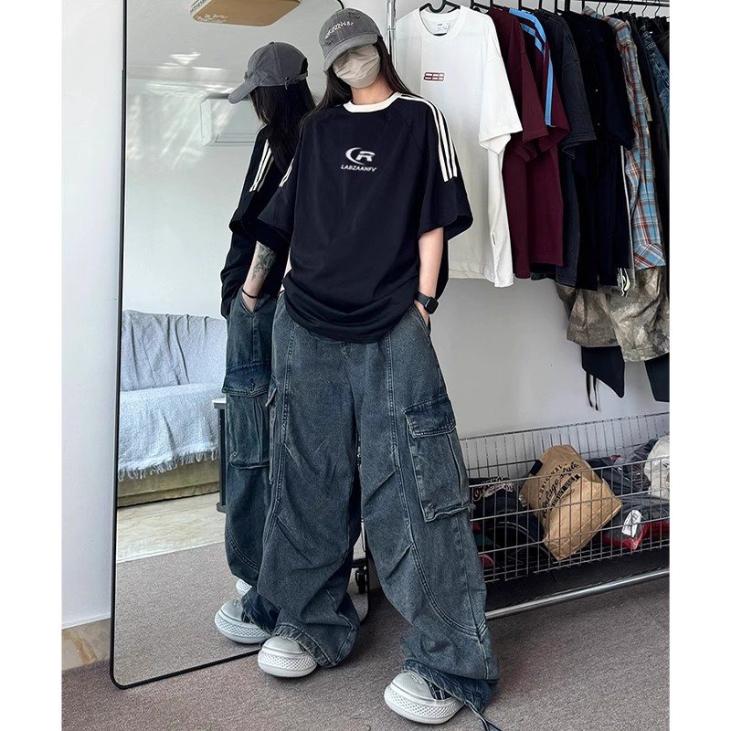 高街情侣宽松上衣 t恤男女夏季 100%纯棉国潮美式 复古拼接插肩短袖