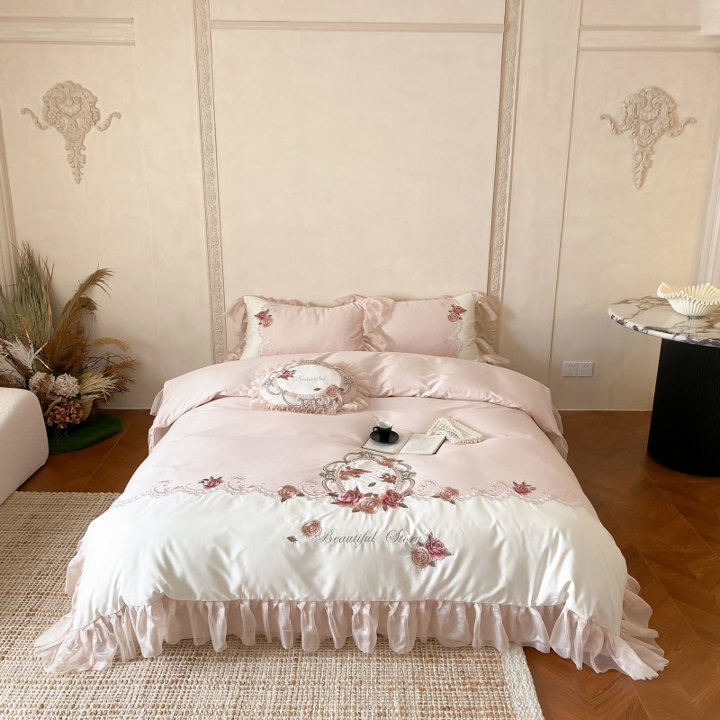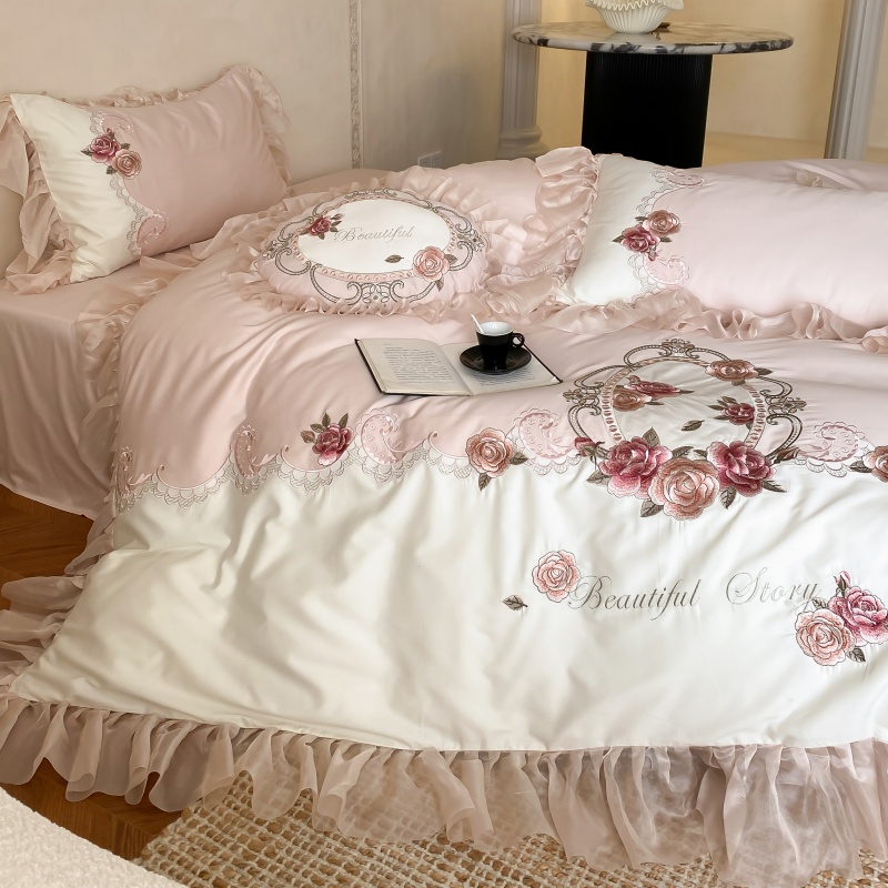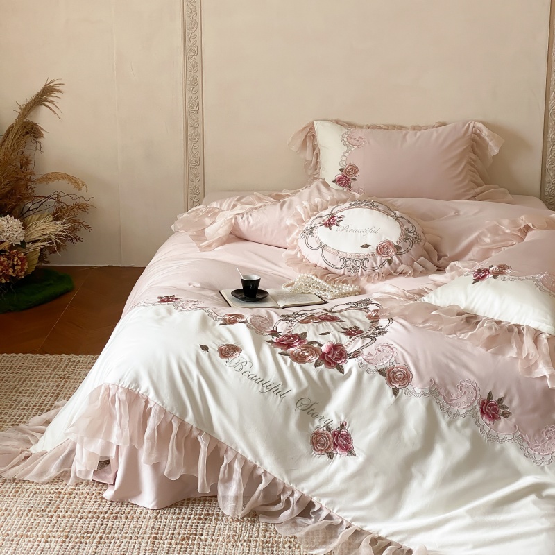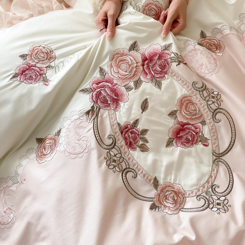 100s澳棉复古法式 四件套浪漫玫瑰花蕾丝花边全棉被套床单