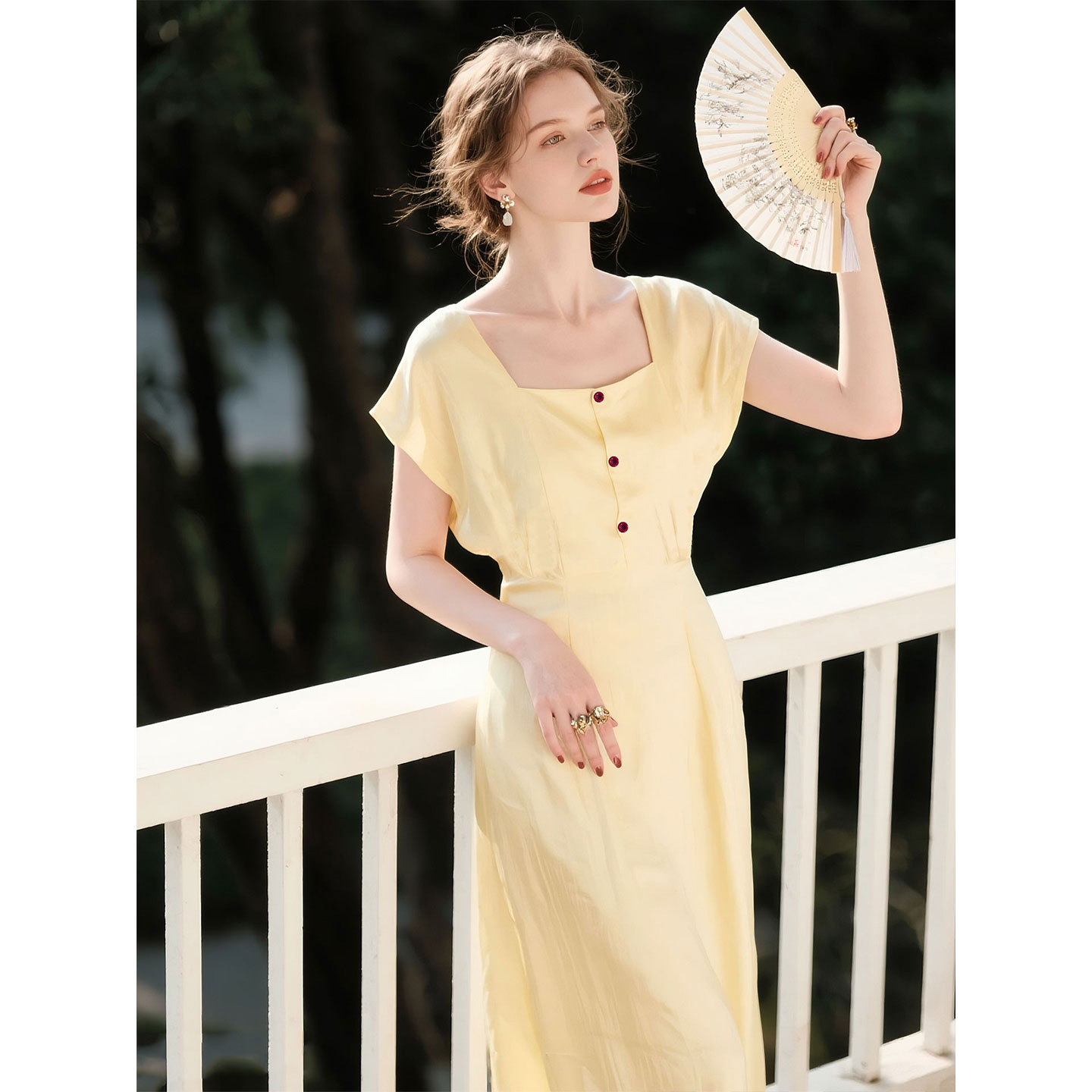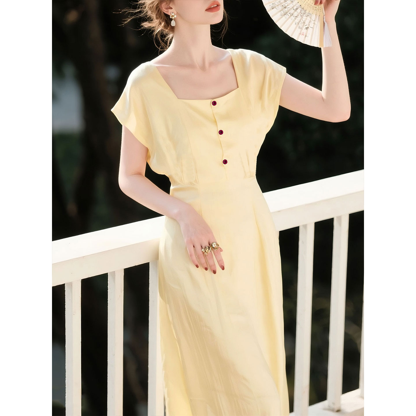 方领巨好看气质裙子 法式 浅黄色莱赛尔天丝连衣裙女2025年夏季 新款