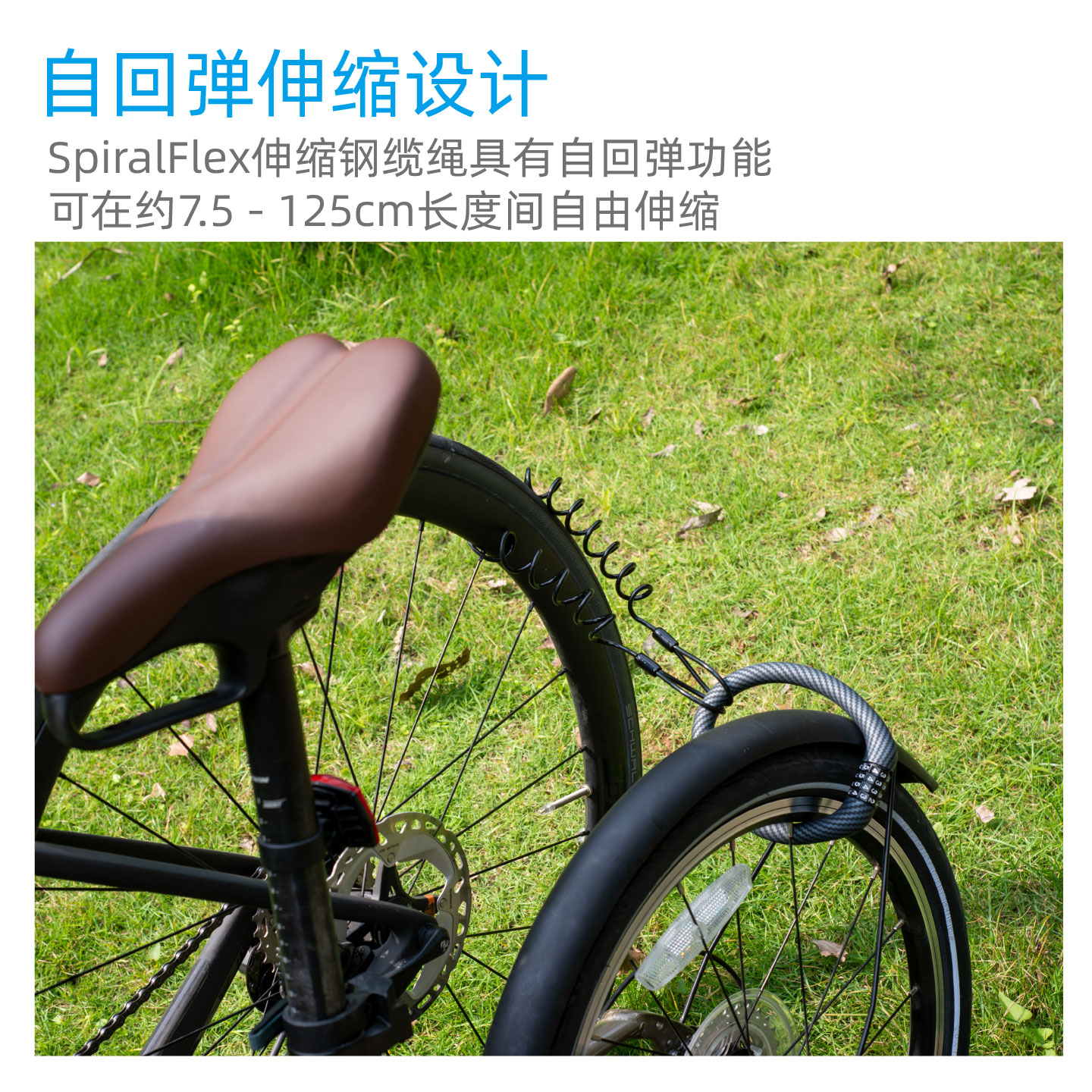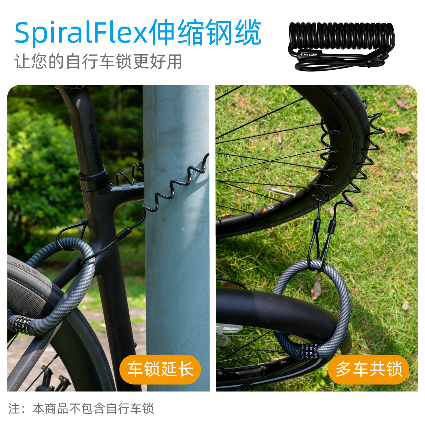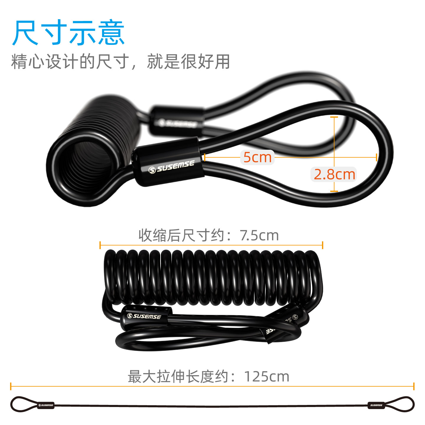 SUSEMSE SpiralFlex自回弹伸缩钢缆绳自行车锁延长钢缆头盔锁钢缆