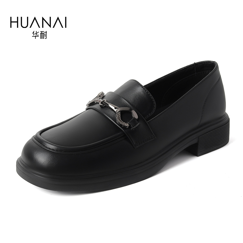 一脚蹬粗跟通勤英伦风黑色小皮鞋 华耐平底乐福鞋 单鞋 新款 2025秋季