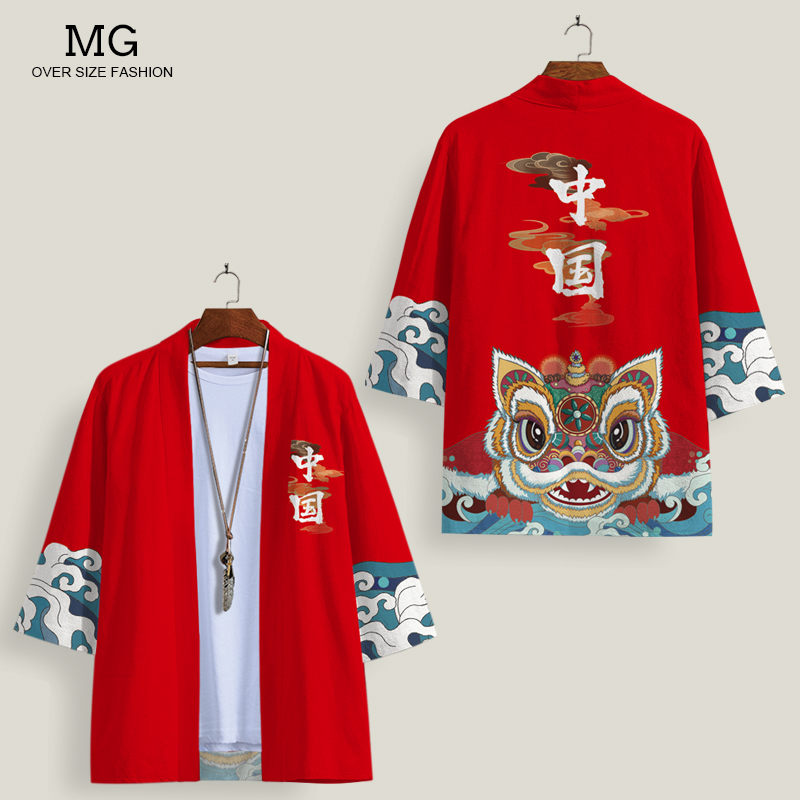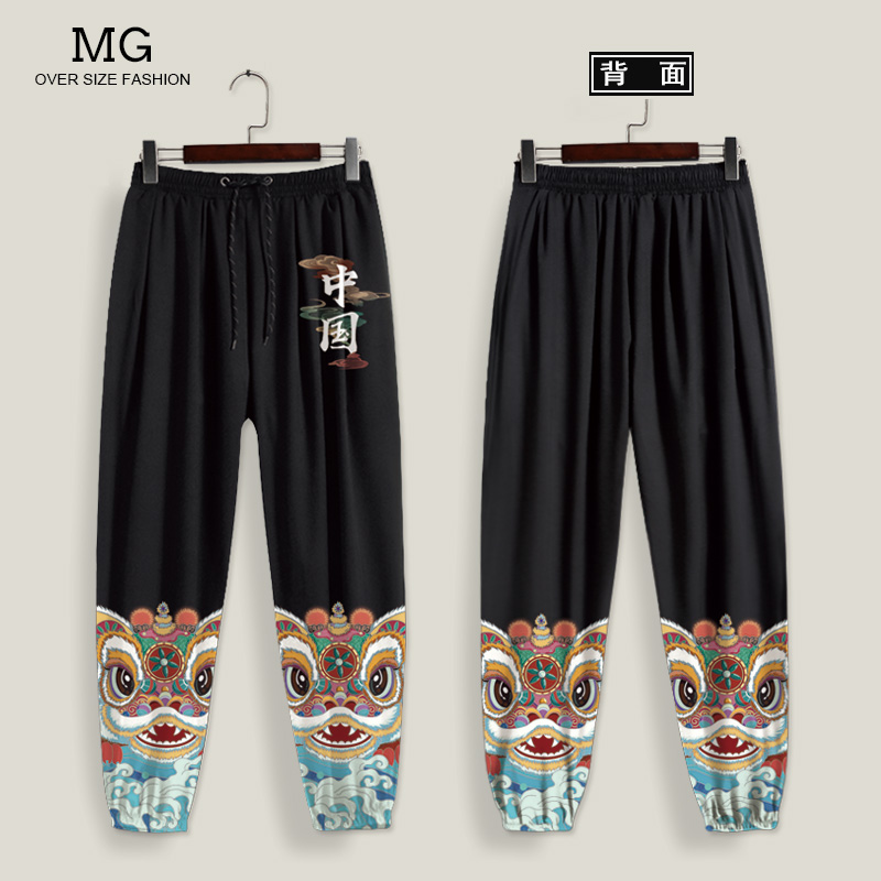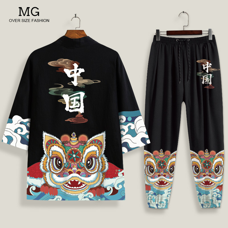 国潮束脚宽松九分裤 男披风外套国风醒狮印花国潮道袍衬衫 套装 夏季