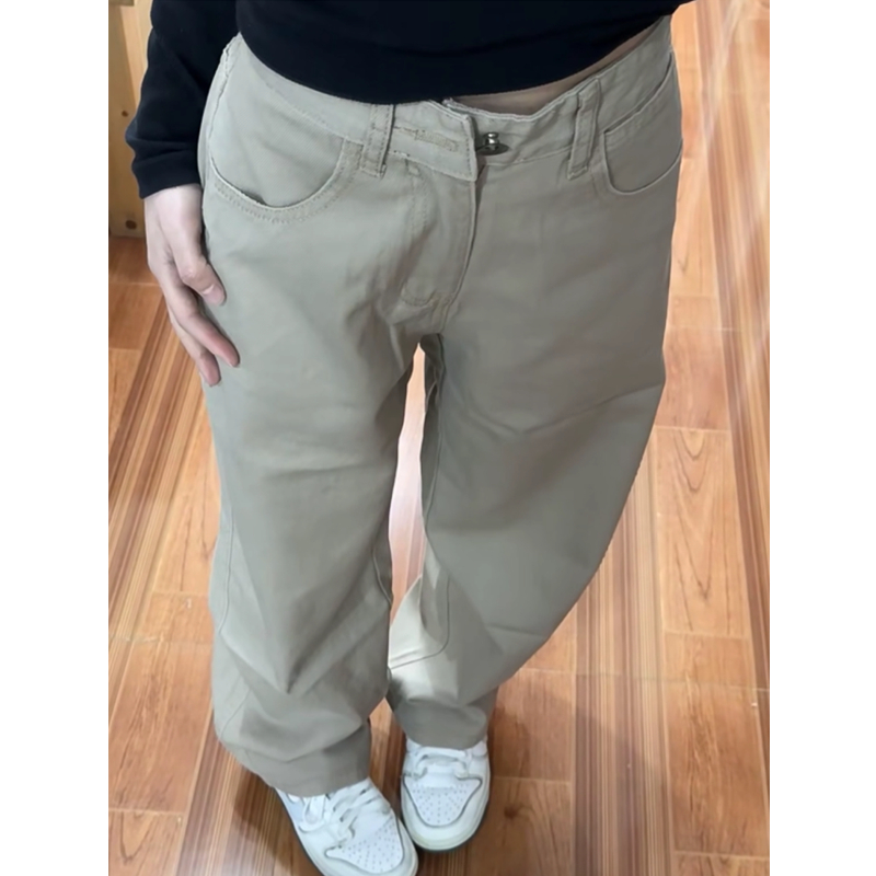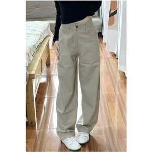 直筒长裤 大码 女高个子梨形身材宽松显瘦窄版 卡其色高腰阔腿牛仔裤