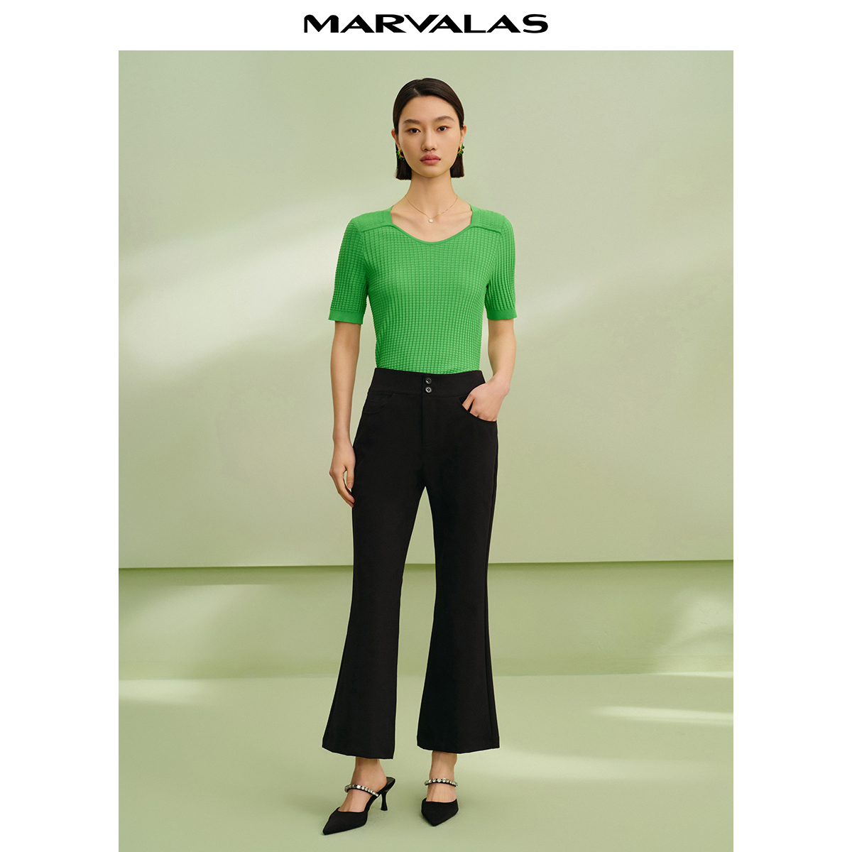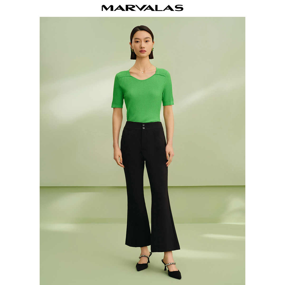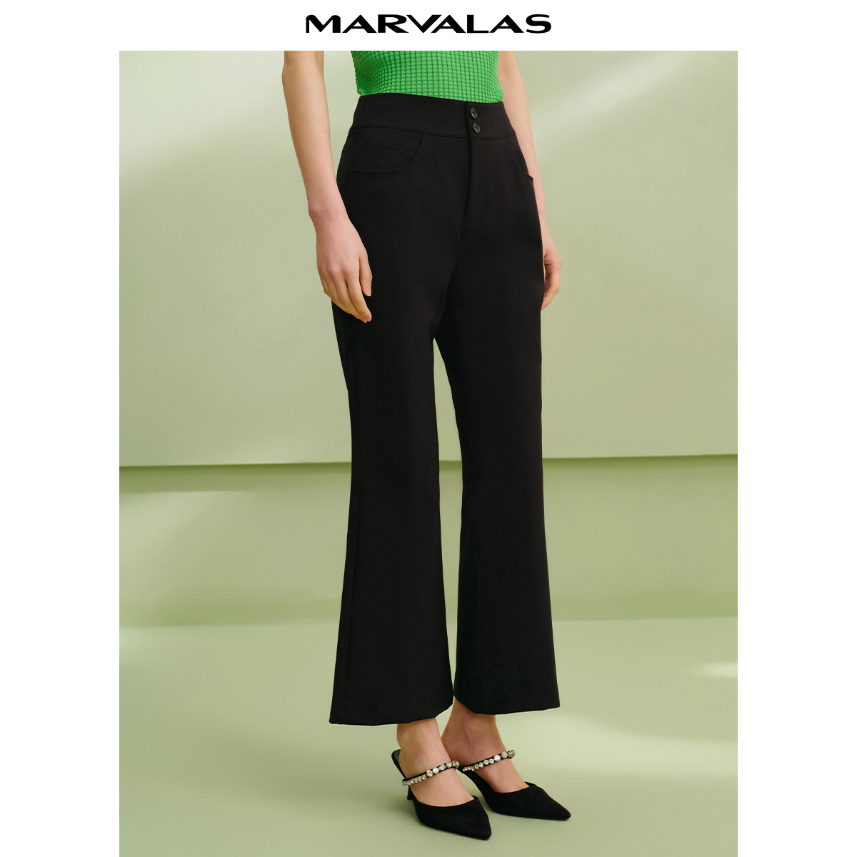 黑色高腰弹力针织时髦休闲长裤 新款 2025秋季 曼德诗显瘦开叉喇叭裤
