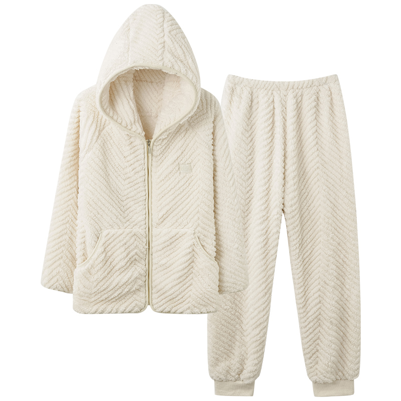 猫人珊瑚绒睡衣女士秋冬季 加绒加厚外套连帽拉链保暖可外穿家居服