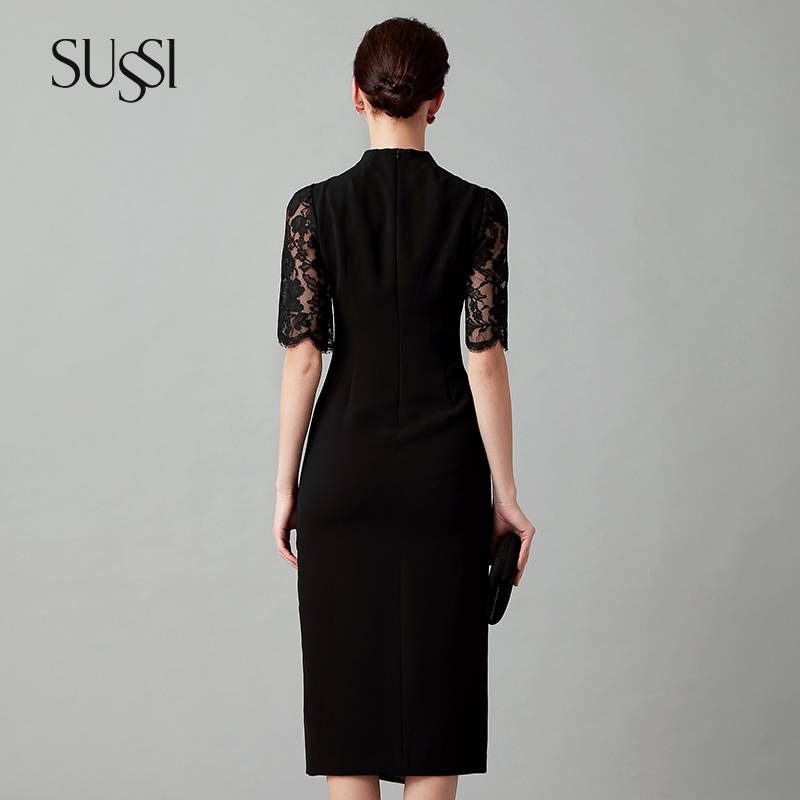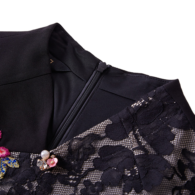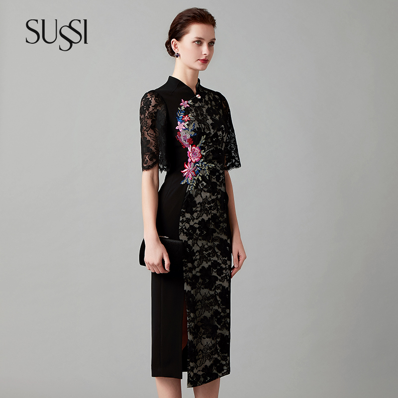 显瘦旗袍连衣裙女 黑色贴花中国风修身 SUSSI 古色商场同款