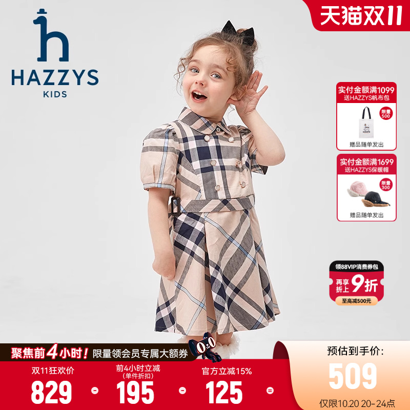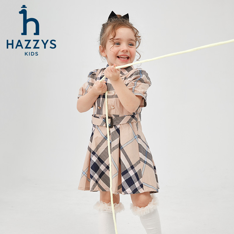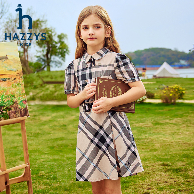 hazzys哈吉斯童装 裙 女童连衣裙2024夏新学院收腰气质格子短袖