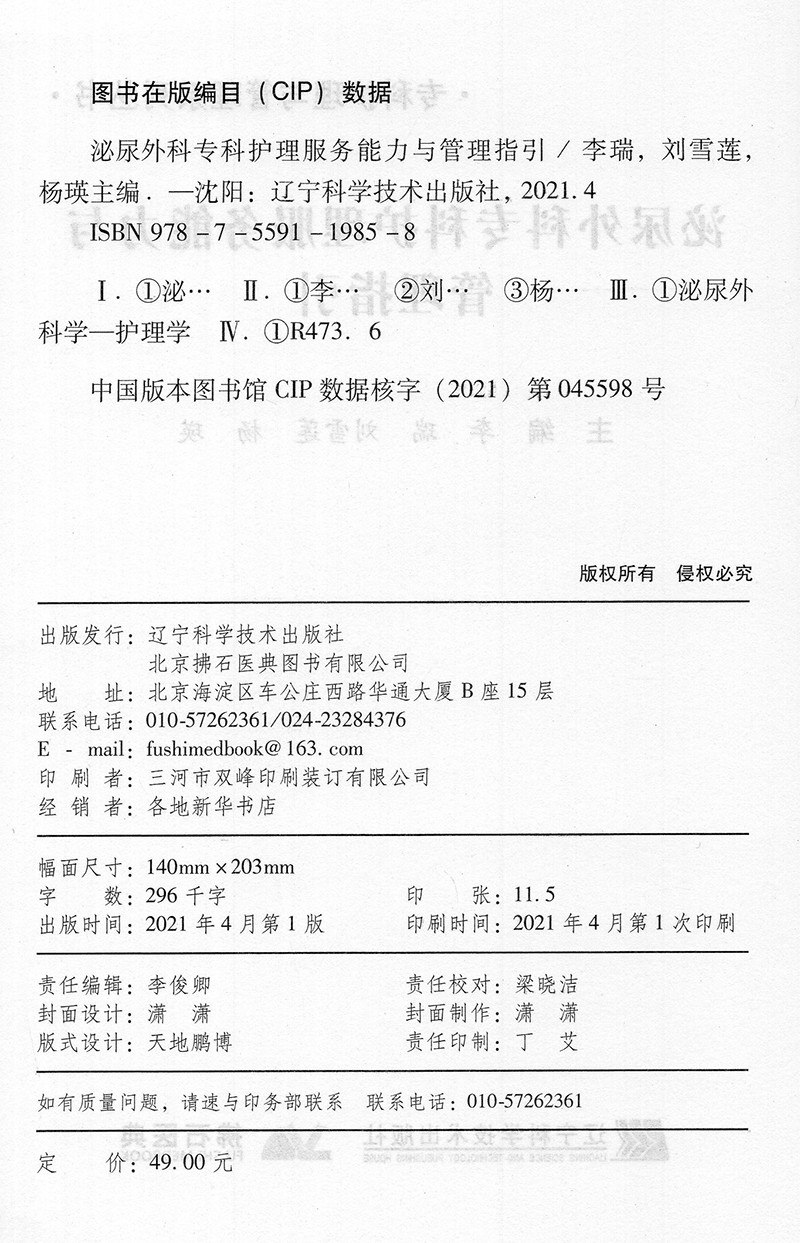 泌尿外科专科护理服务能力与管理指引专科护理与管理系列丛书李瑞刘雪莲等主编辽宁科学技术出版 社9787559119858