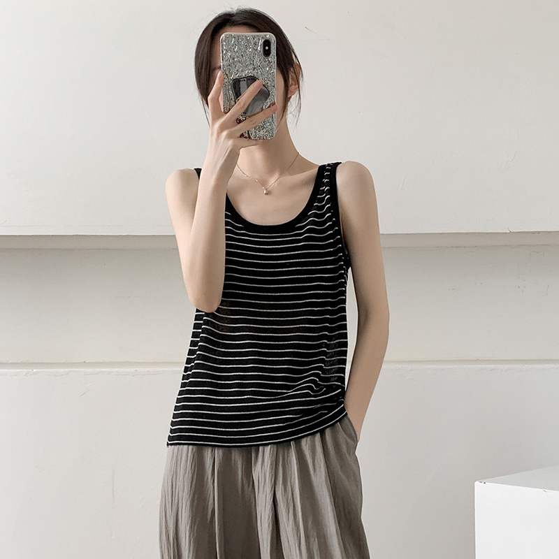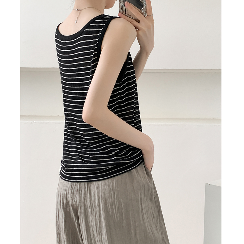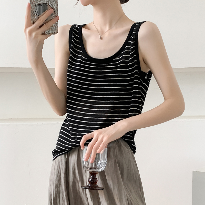 亚麻宽肩带吊带背心夏女外穿宽松无袖 黑色条纹冰丝针织上衣 打底衫