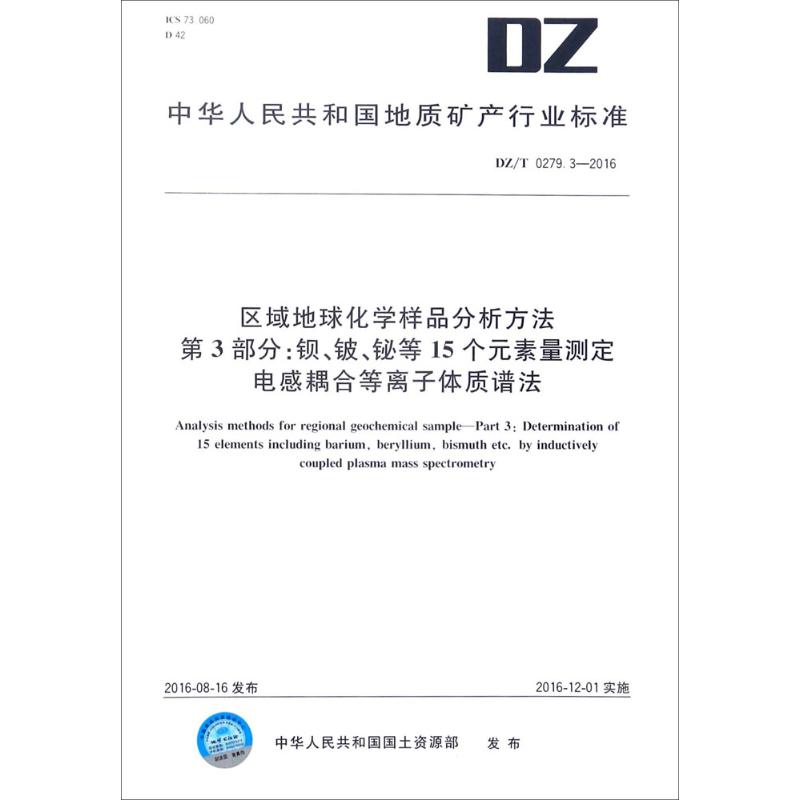 铍 铋等15个元 发布 第3部分 著 中华人民共和国国土资源部 钡 电感耦合等离子体质谱 区域地球化学样品分析方法 素量测定