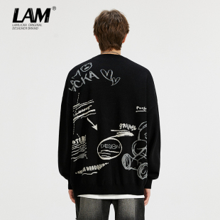 保暖情侣针织衫 LAMLICKA2024新款 慵懒风字母圆领毛衣男宽松秋冬季
