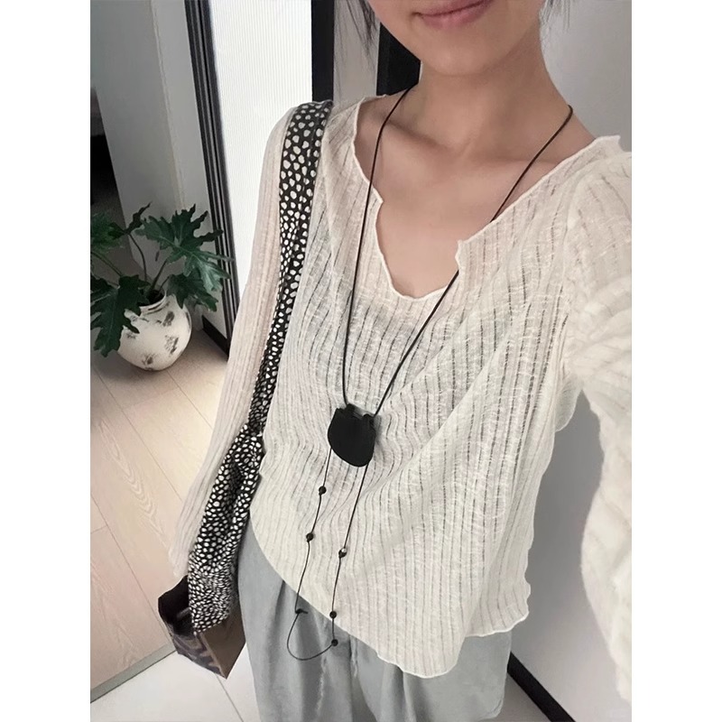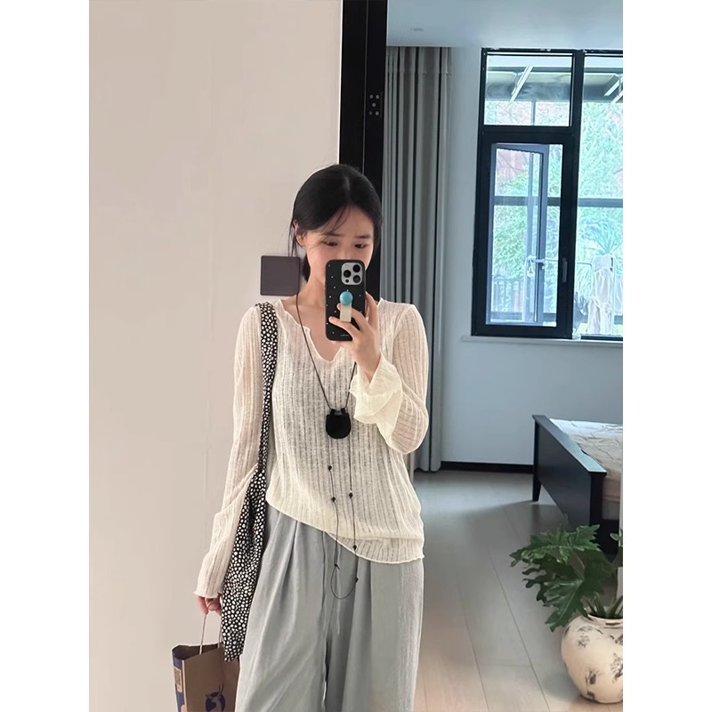 微透宽松显瘦防晒空调衫 罩衫 薄纱上衣 t恤女春夏季 白色v领冰丝长袖