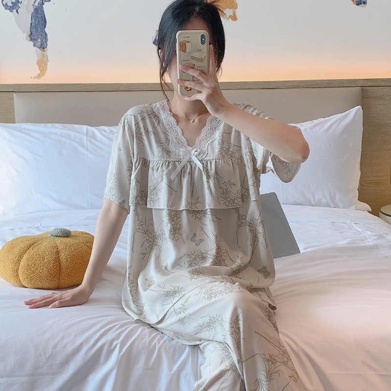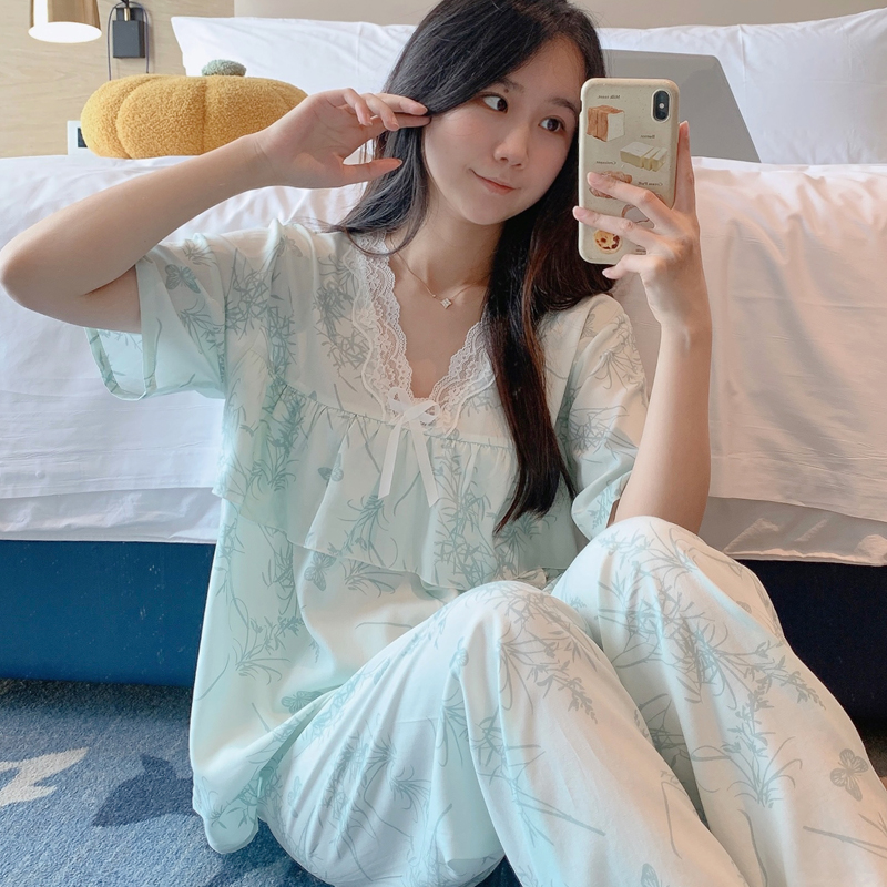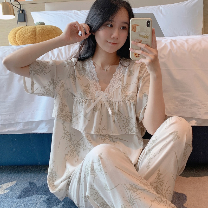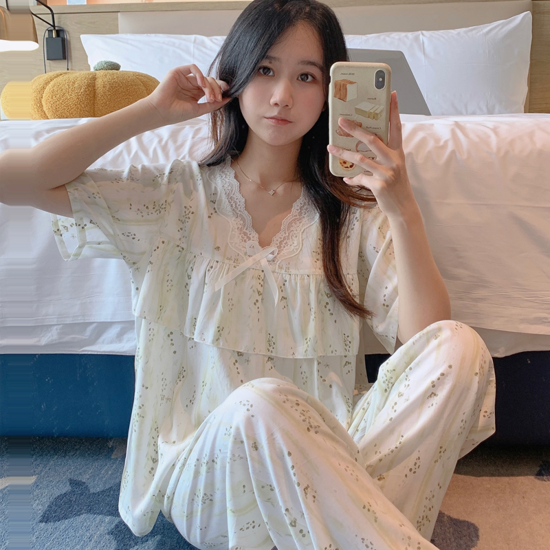 长裤 夏季 短袖 防凸点人造棉家居服韩版 绵绸空调服 女士棉绸睡衣套装