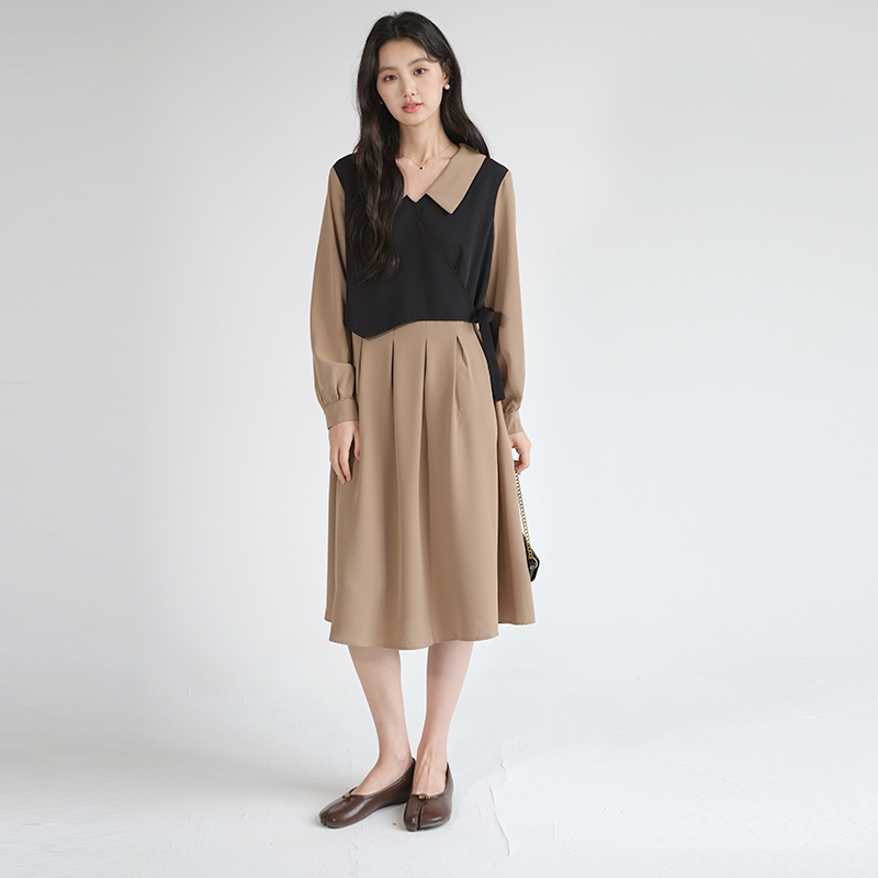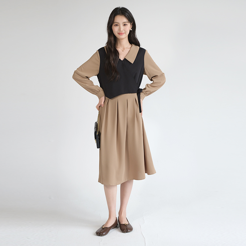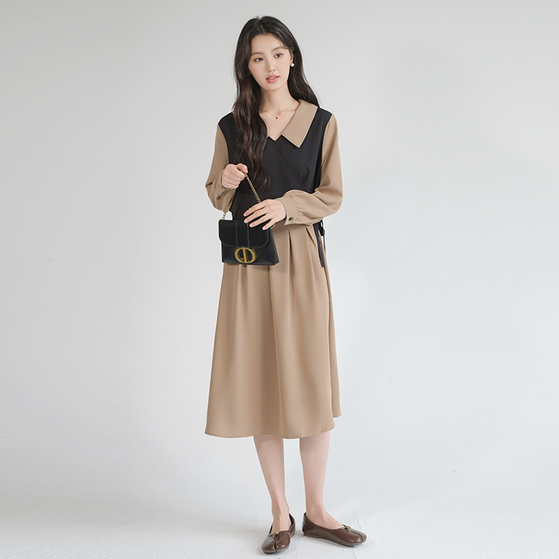 轻熟风假两件长袖 新款 连衣裙 2025秋装 韩系收腰长裙 蓝若水大码