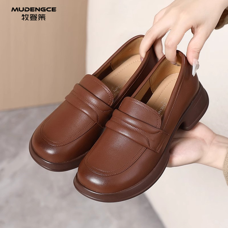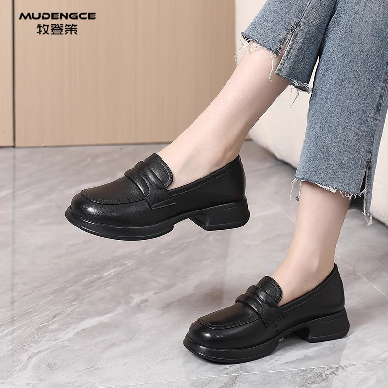 小皮鞋 中年妈妈休闲舒适一脚蹬大码 女春夏新款 复古软底粗跟乐福鞋