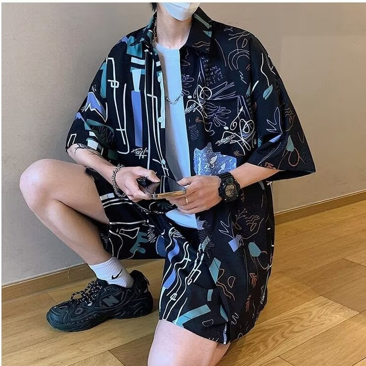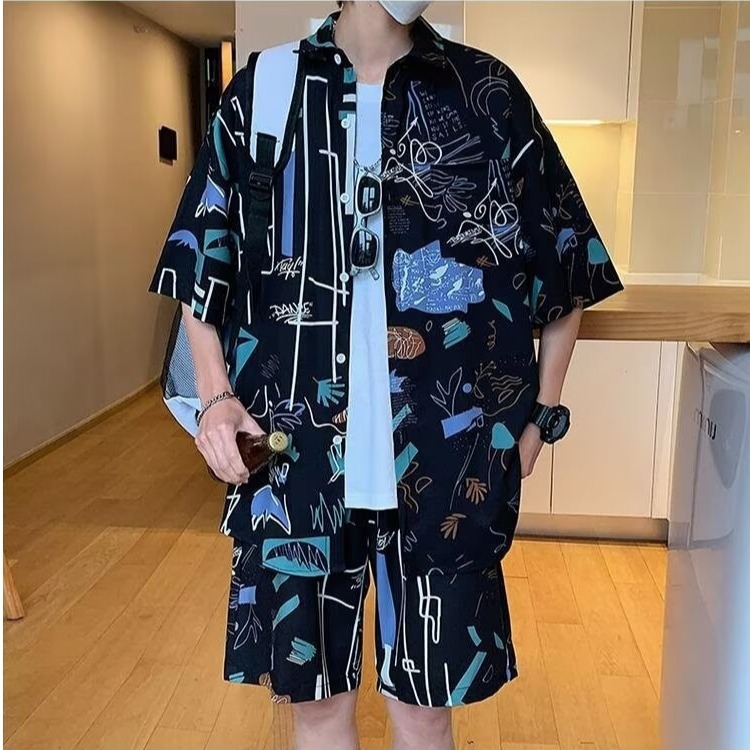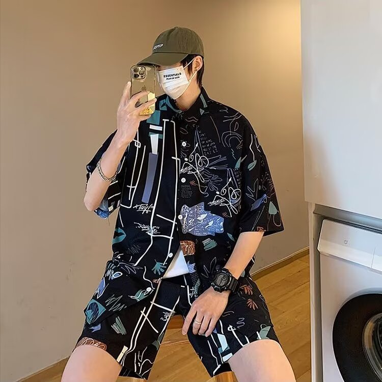 300斤夏威夷花衬衫 海边两件套冰丝沙滩套装 短袖 潮流短裤 夏季 大码