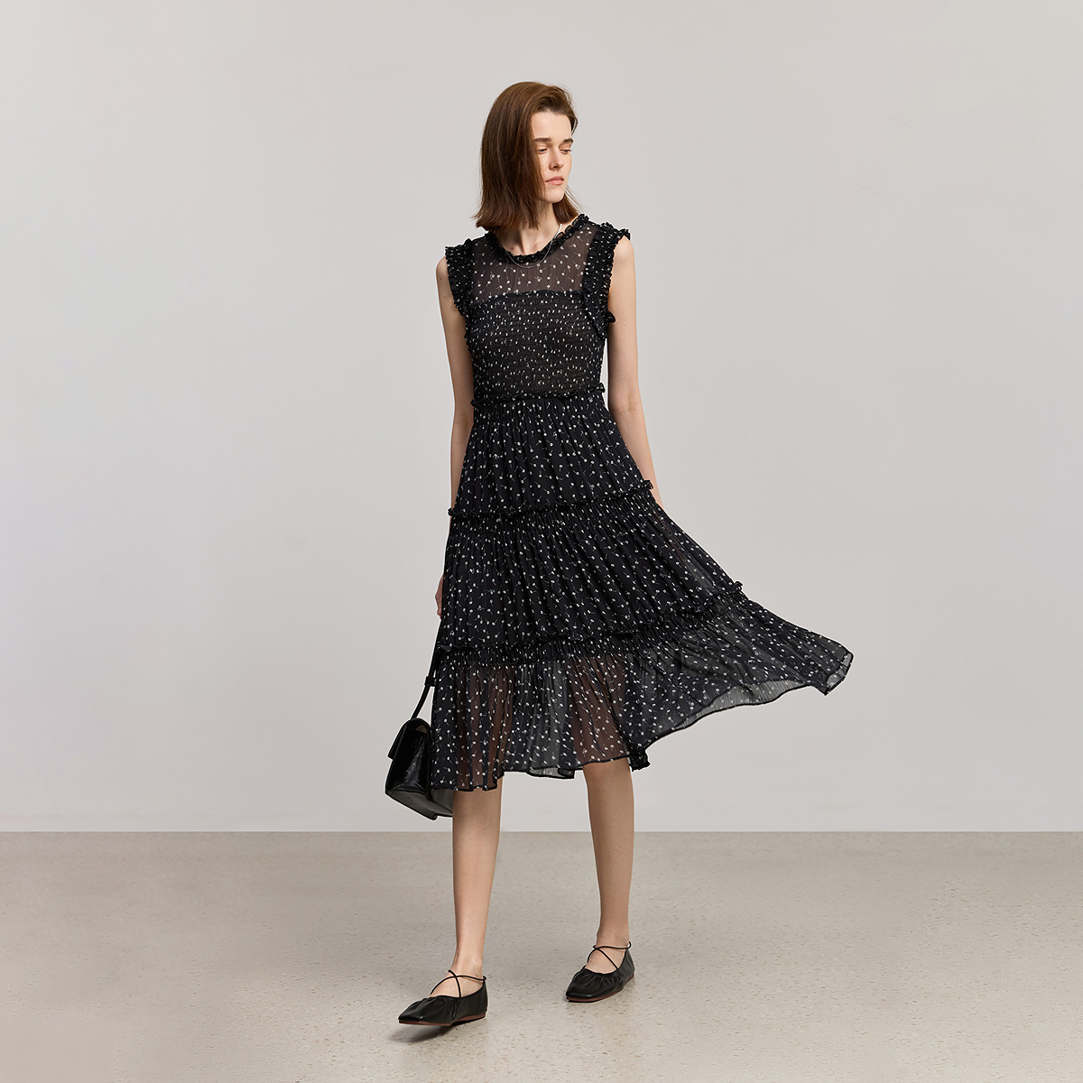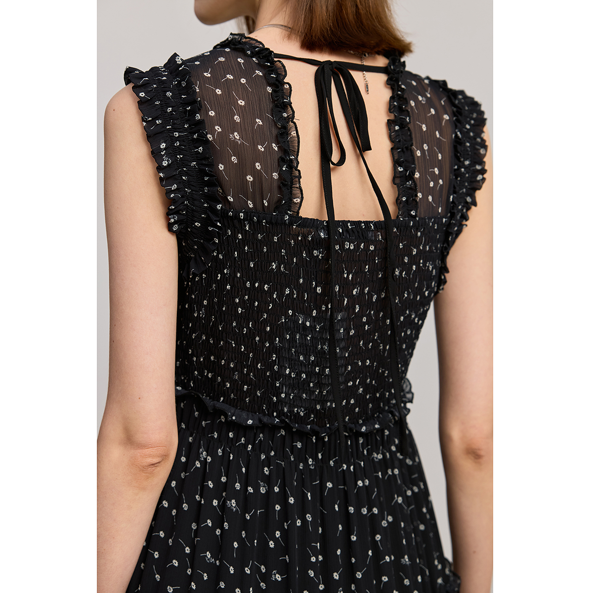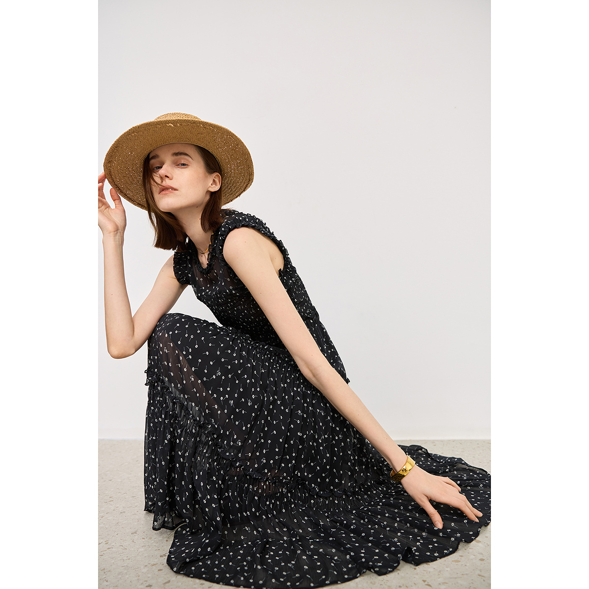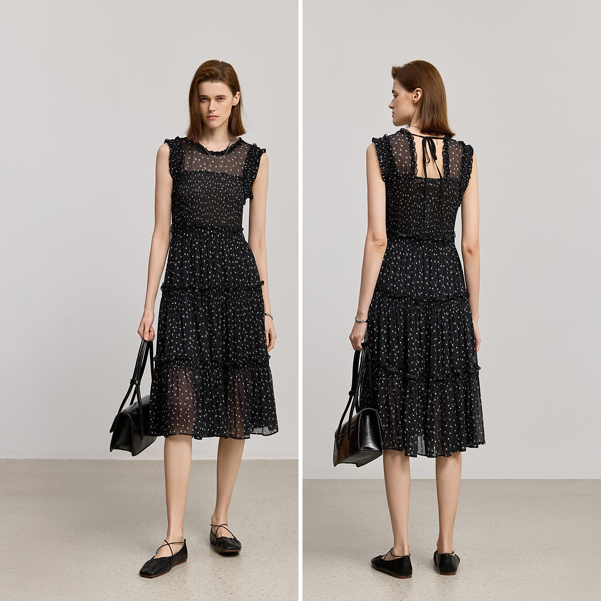 高腰显瘦连衣裙小黑裙女 复古碎花轻薄花边无袖 LILY2025夏新款 法式