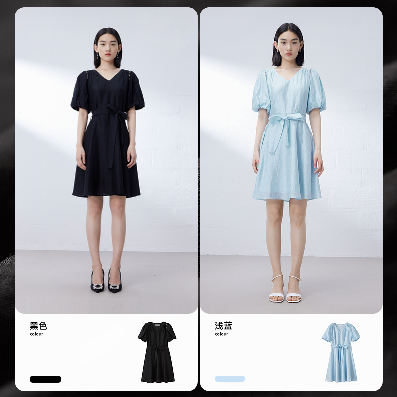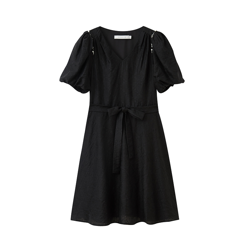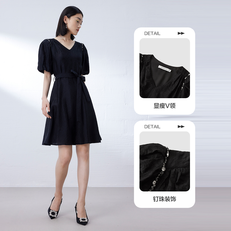 新款 秋季 2025莱赛尔v领收腰裙子 天丝连衣裙女装 水云间黑色泡泡袖