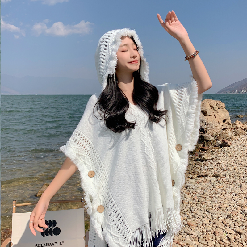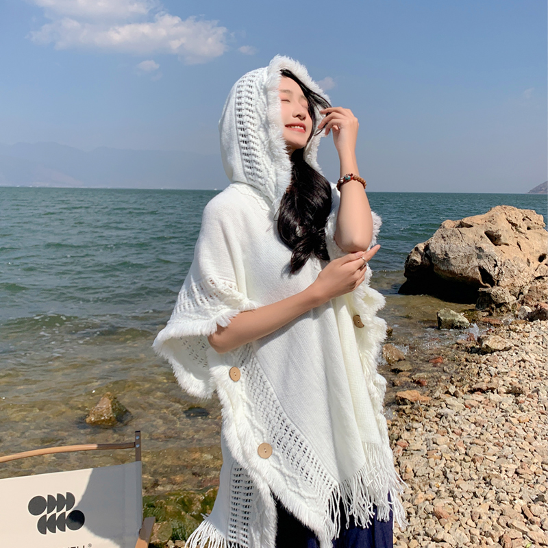 森系披肩波西米亚流苏连帽针织衫 女云南丽江旅行网红穿搭斗篷外搭