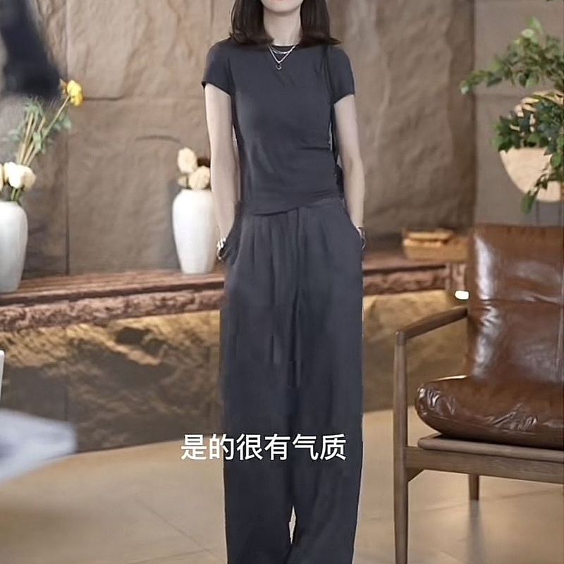 款 气质显瘦两件套女夏季 T恤休闲减龄直筒阔腿裤 高级简约百搭短袖