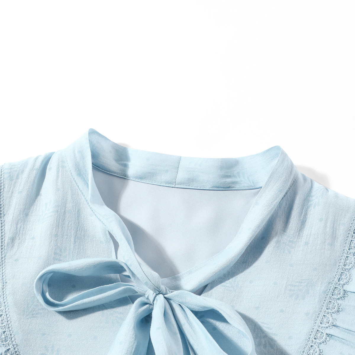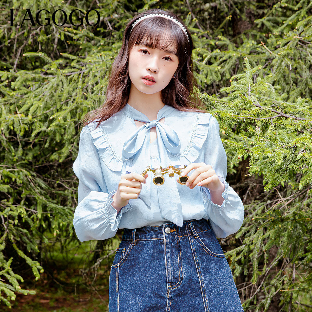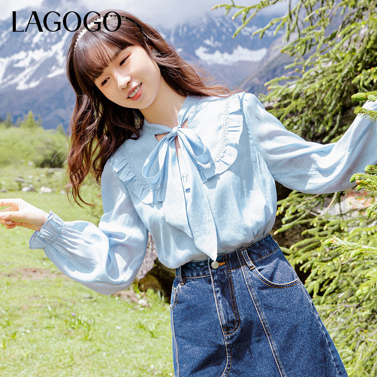 木耳边暗纹浅蓝色长袖 V领泡泡袖 上衣女 新款 Lagogo拉谷谷秋季