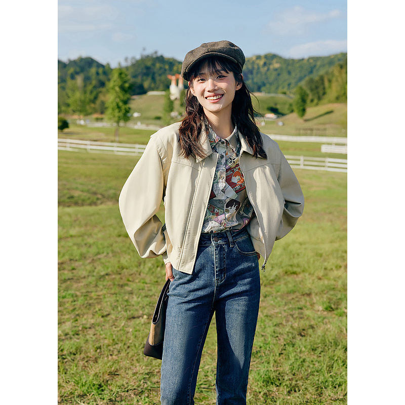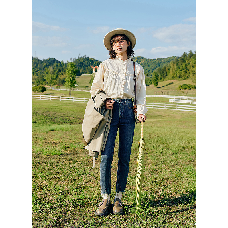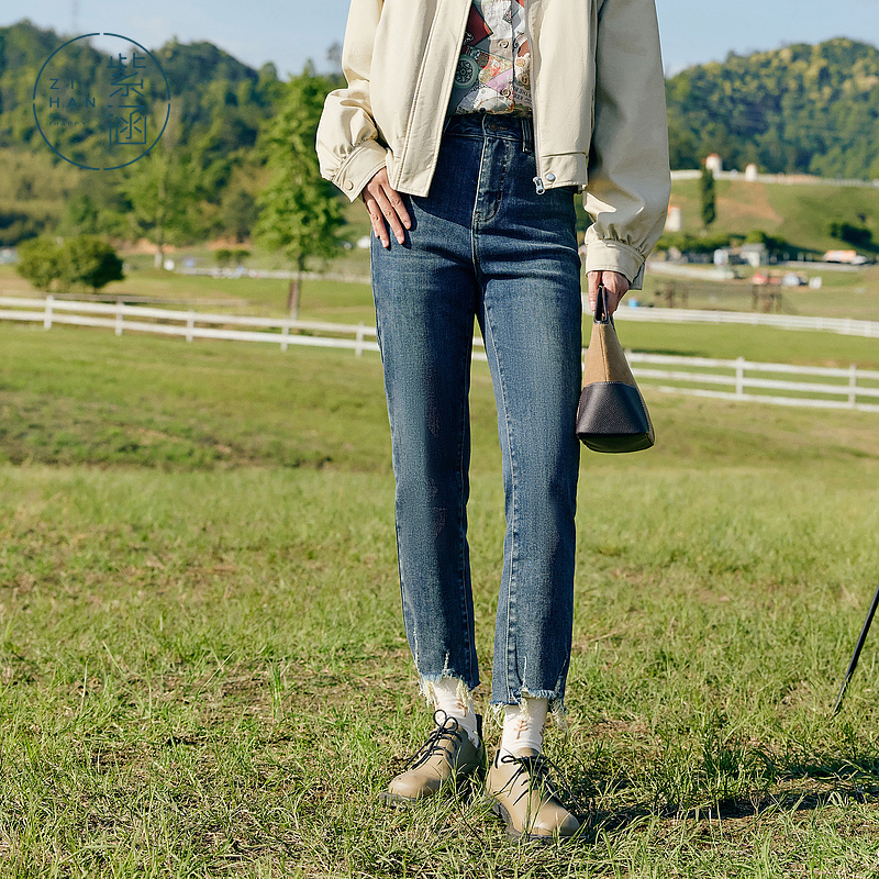 高腰牛仔裤 时尚 九分裤 小众毛边百搭休闲裤 女秋季 紫涵锥形小脚修身