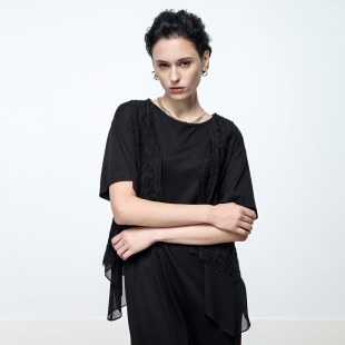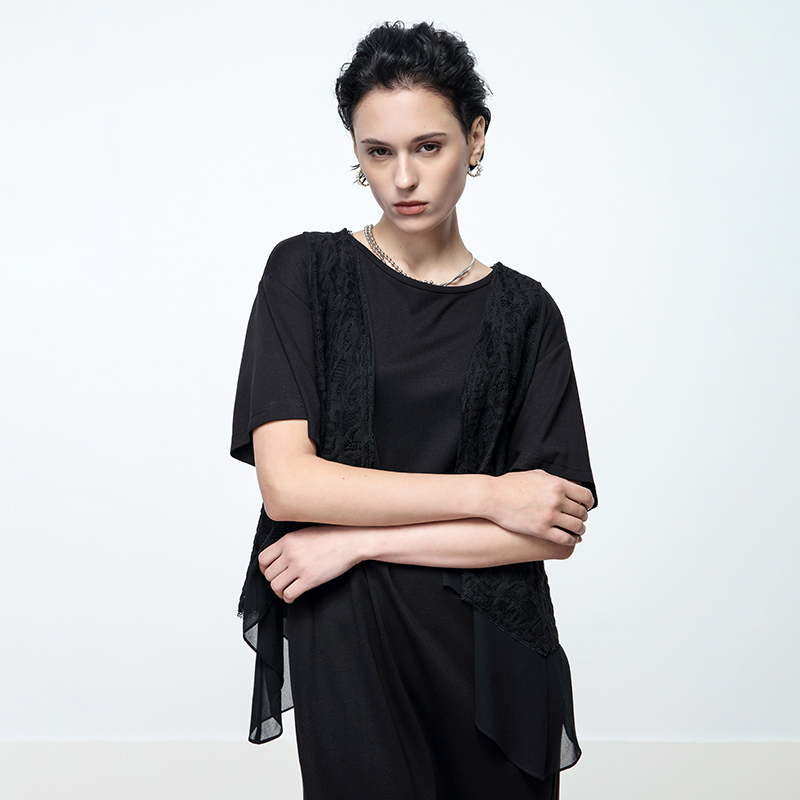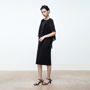 Keywearcloud奇威夏季 直筒裙子连衣裙 圆领黑色气质纱感飘逸中长款