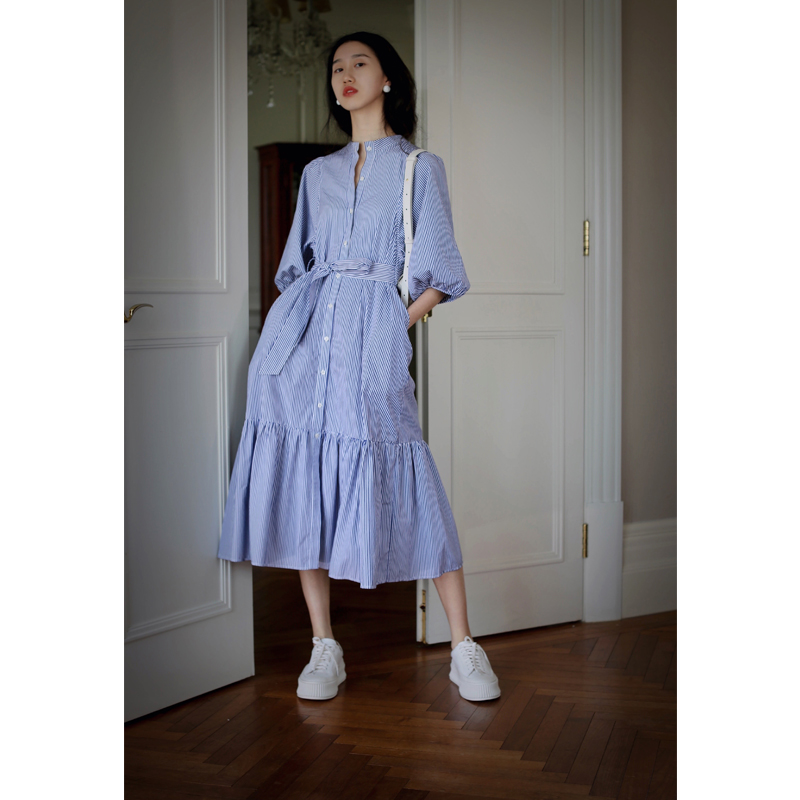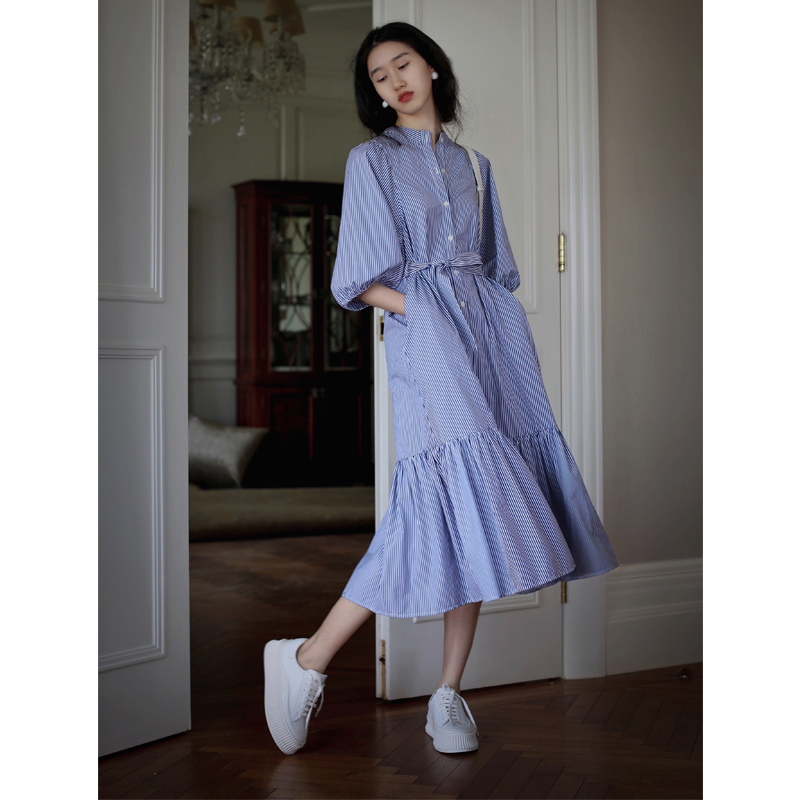 无有无印全棉舒适抗皱蓝色条纹衬衫 气质过膝显瘦连衣裙22008