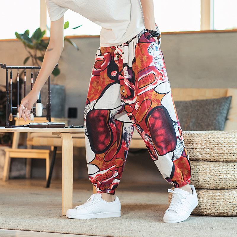 灯笼裤 亚麻裤 胖子休闲长裤 加肥加大码 春 子男中国风印花束脚哈伦裤
