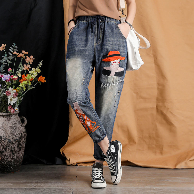 松紧腰九分哈伦裤 2023夏季 女民族风文艺刺绣大码 高腰牛仔裤 女 新款