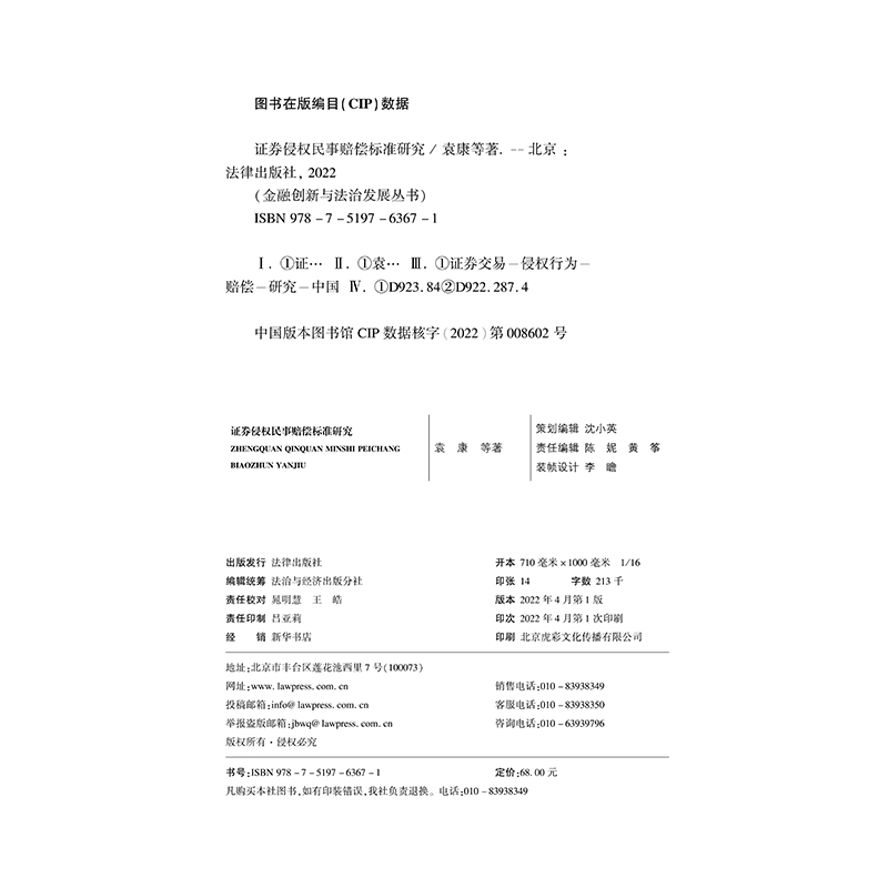 法律出版 正版 袁康 证券侵权民事赔偿标准研究 社9787519763671 2022新书