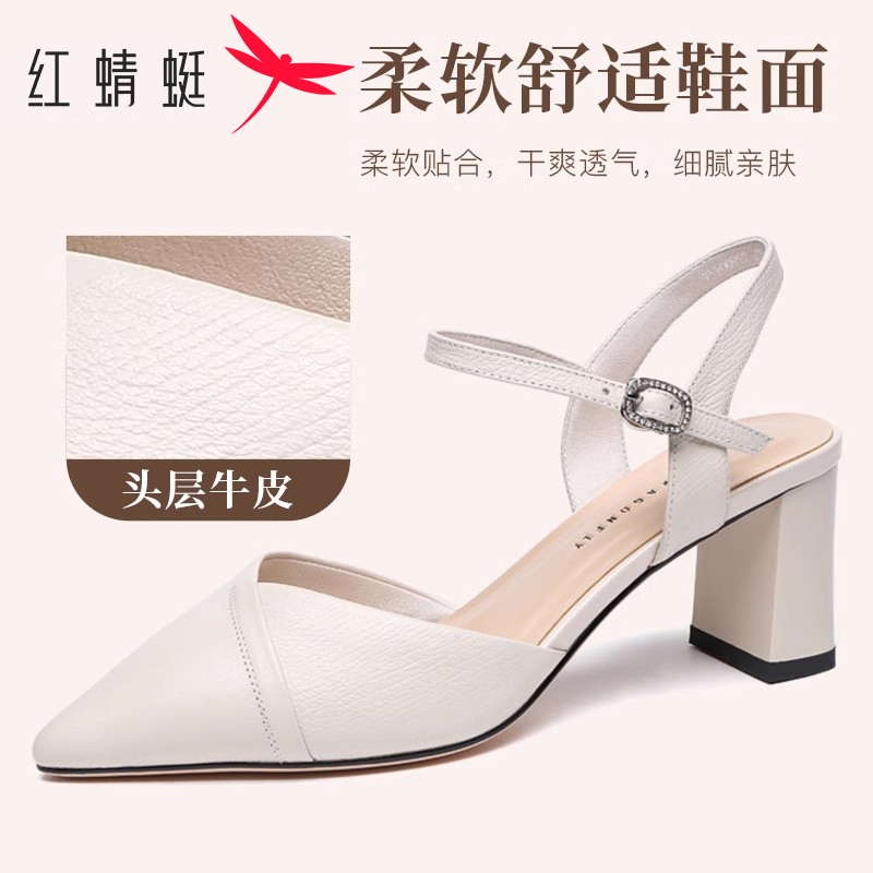 女通勤上班鞋 红蜻蜓尖头包头凉鞋 粗跟女士妈妈凉鞋 高跟鞋 真皮女鞋