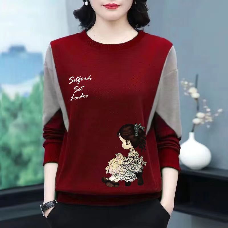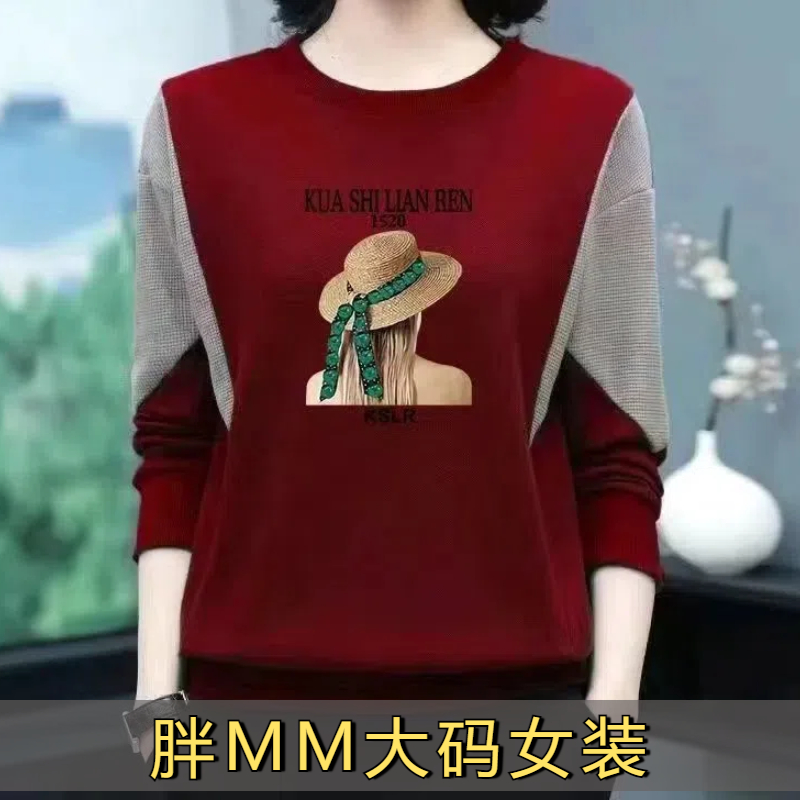 打底衫 清仓捡漏 印花拼接长袖 卫衣女春秋季 100%纯棉中年圆领大码
