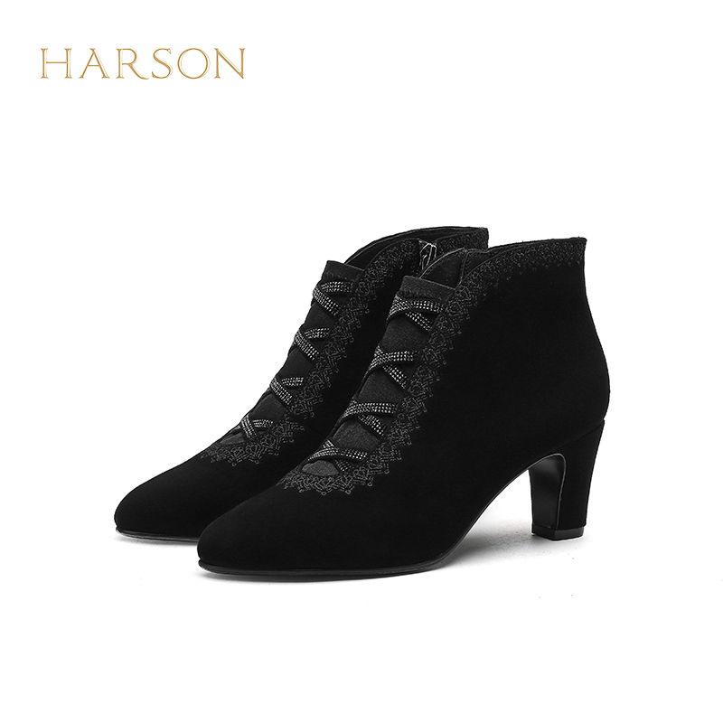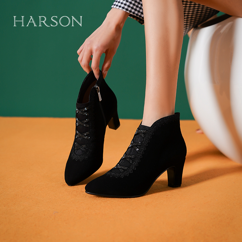 2025秋新款 哈森气质绒面深口高跟鞋 女单鞋 黑色皮鞋 HS267907 新中式