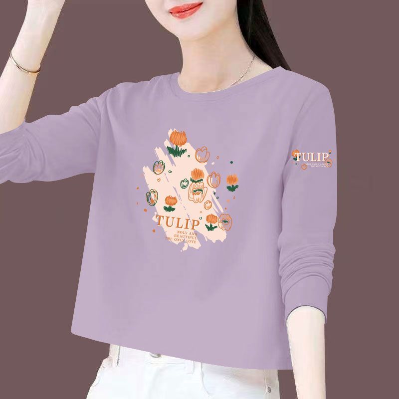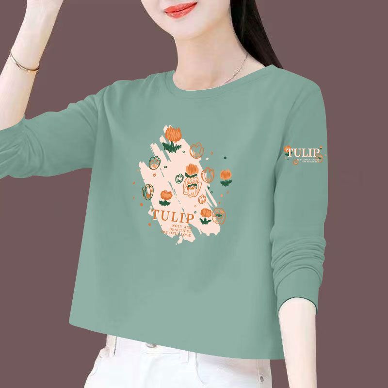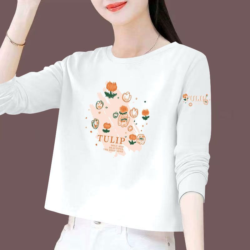洋气宽松显瘦小个子圆领上衣 印花T恤女时尚 春秋纯棉短款 高腰长袖
